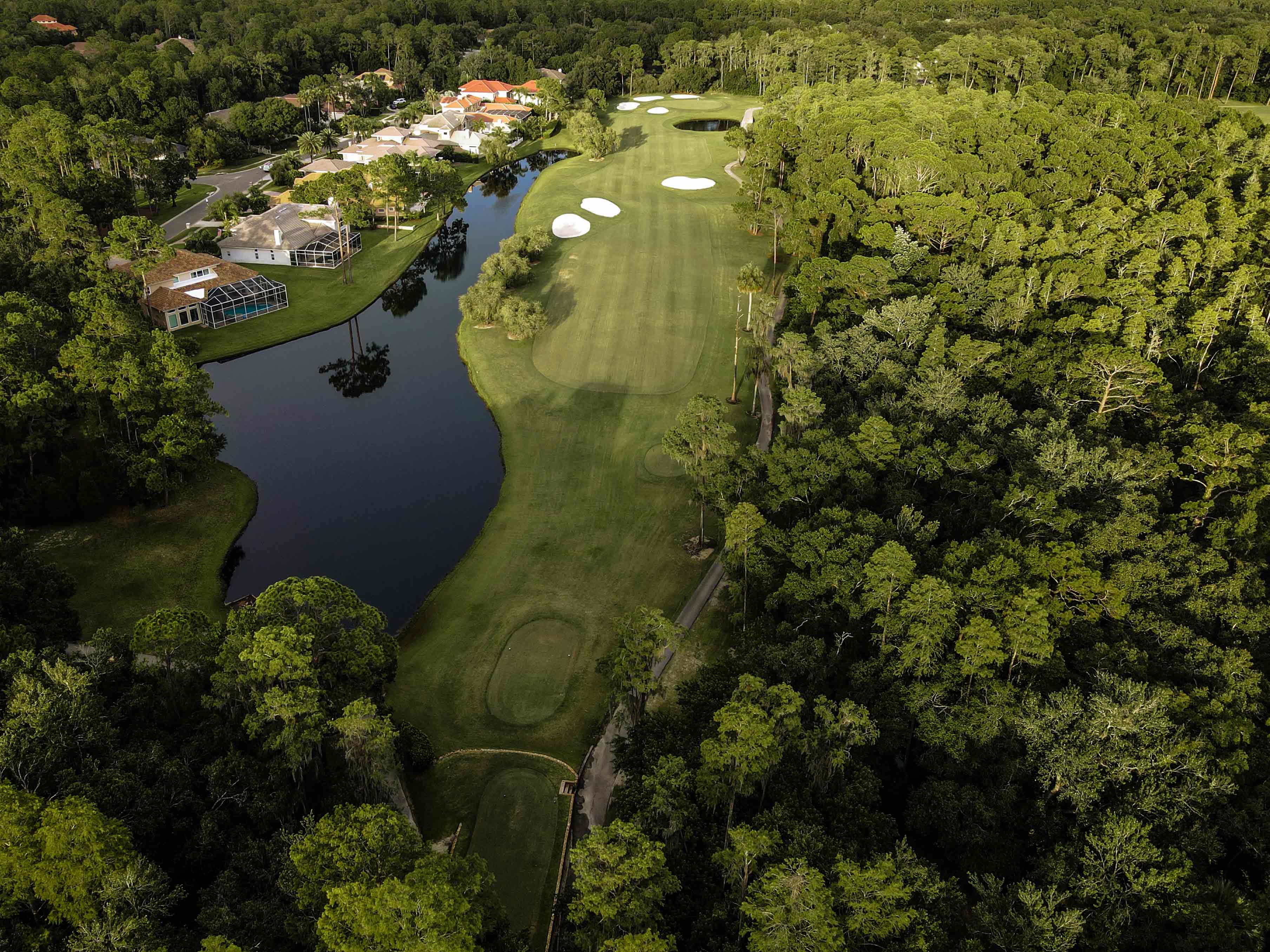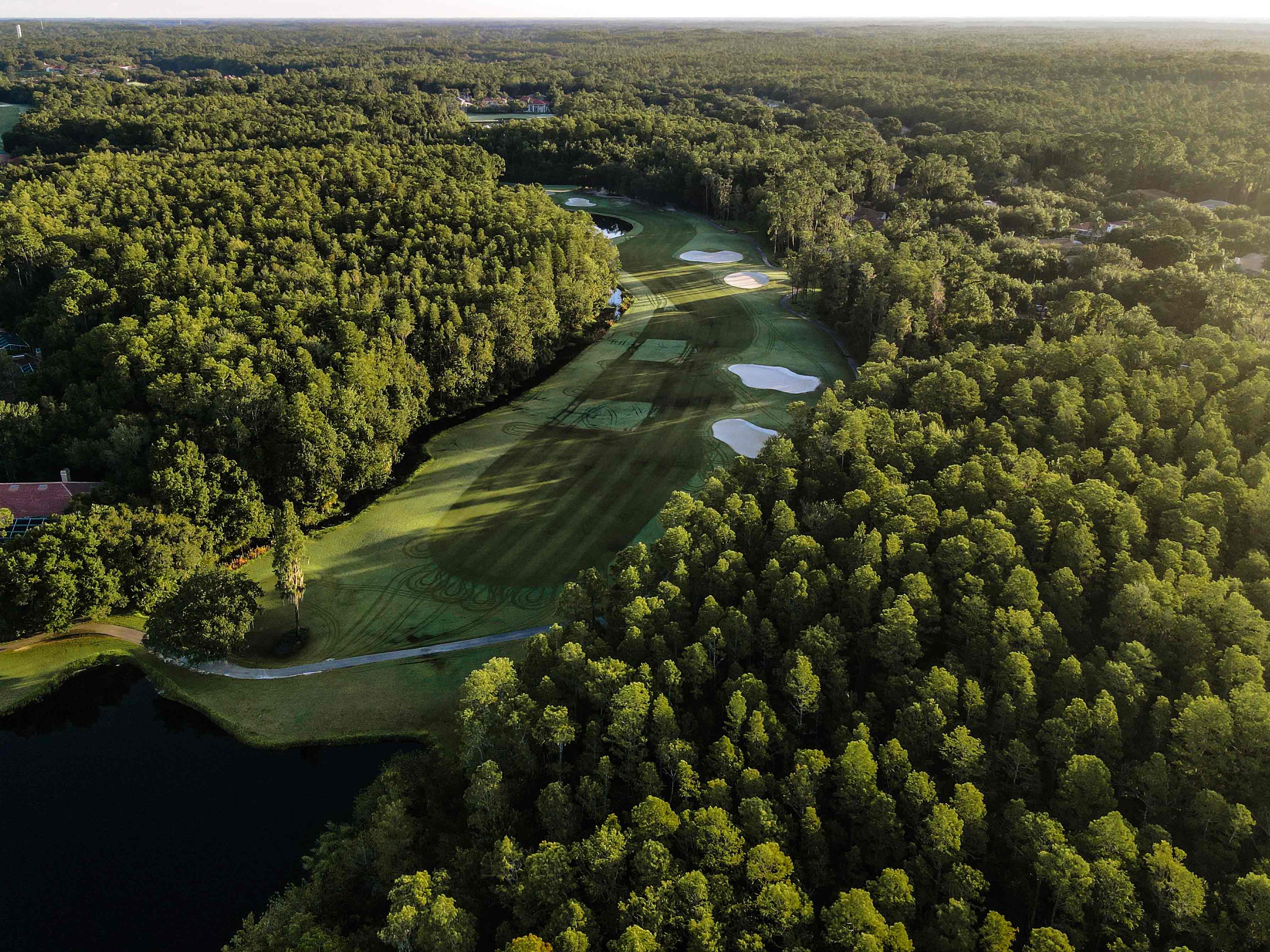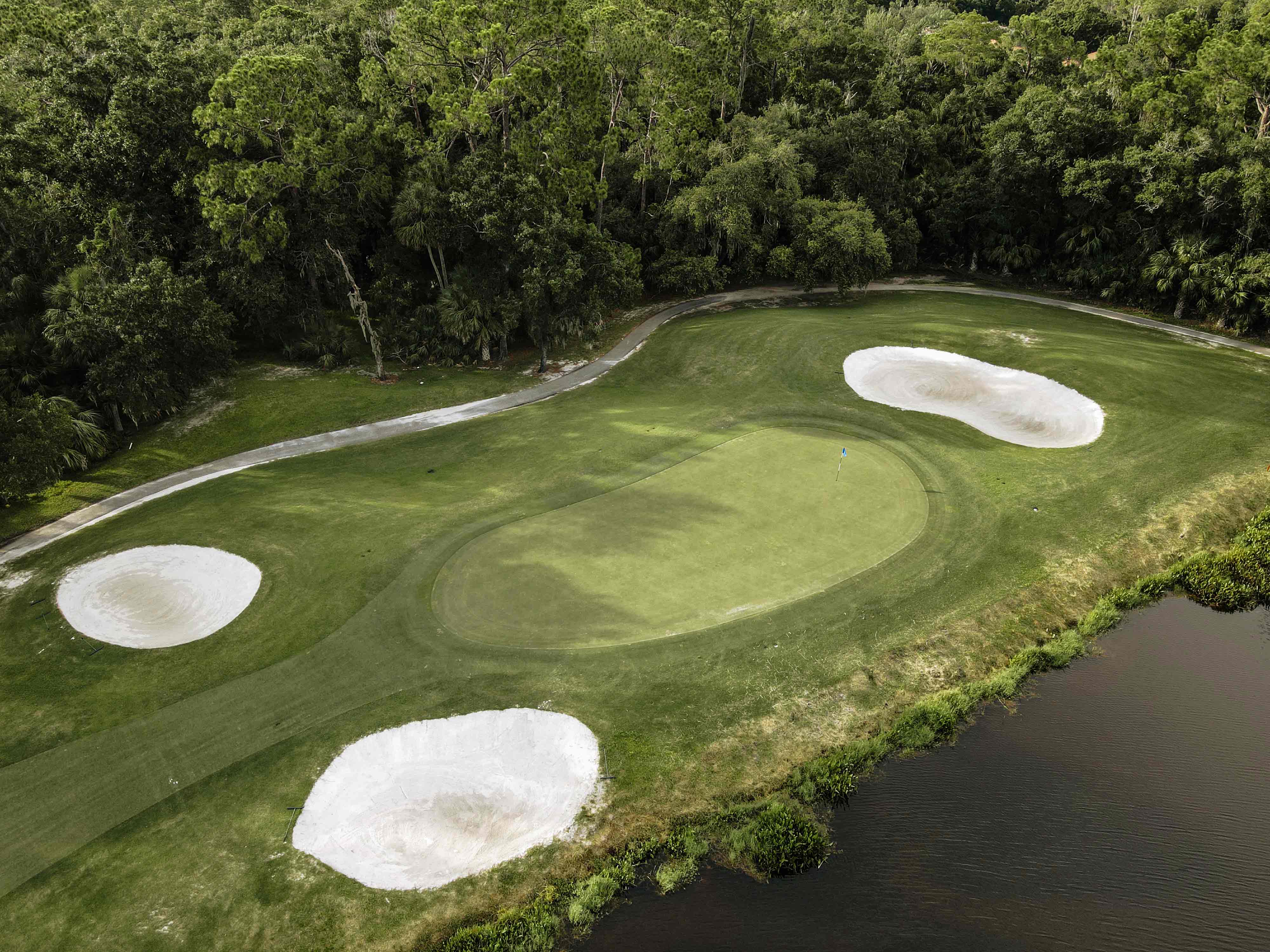 | Signature hole, three shot par 5, important to miss the fairway bunkers, water and bunkers guard the green |