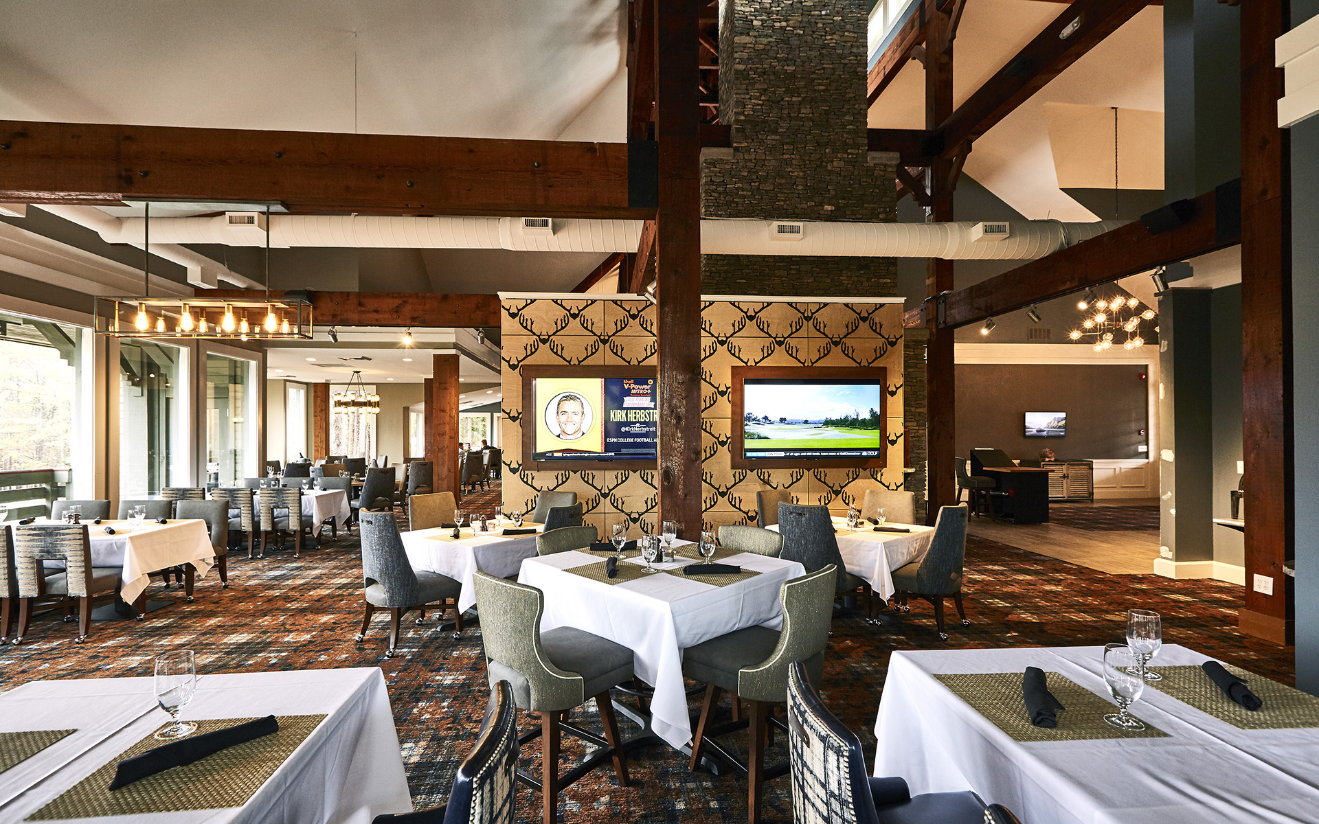 Eagle Watch's 8,500-square-foot clubhouse is reminiscent of a turn-of-the-century lodge. The facility includes a fully-stocked Pro Shop, three dining rooms, men's and women's changing rooms and a spacious lobby that serves as a tribute to Arnold Palmer. The heart of this warm and inviting space is the main dining room, featuring large, exposed-pine beams and a majestic stone fireplace that reaches to the top of the 25-foot cathedral ceiling. The total area can accommodate up to 150 guests for receptions.