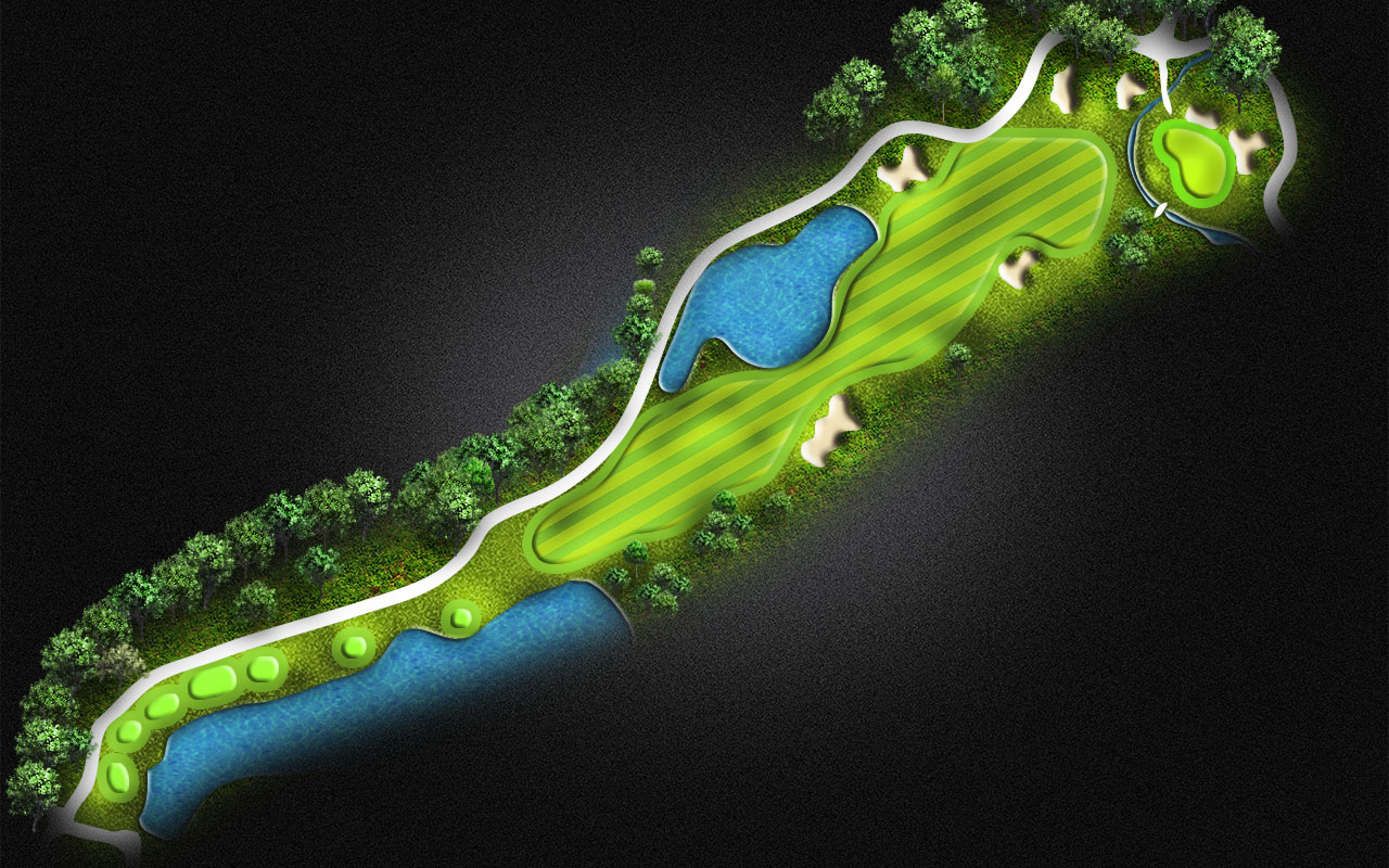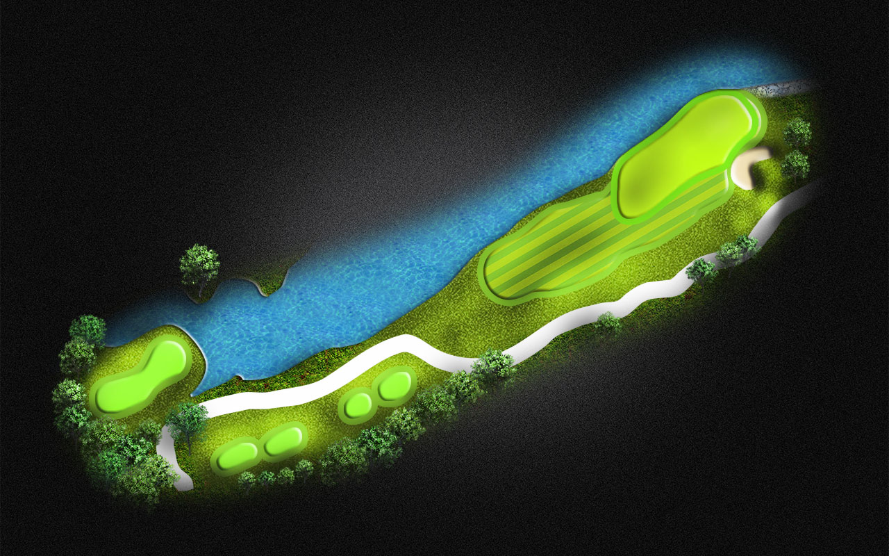 A demanding tee shot on the Par 5 is crucial. You must lay up between the water on the right and left. Long hitters will have a chance to get to the green in 2.