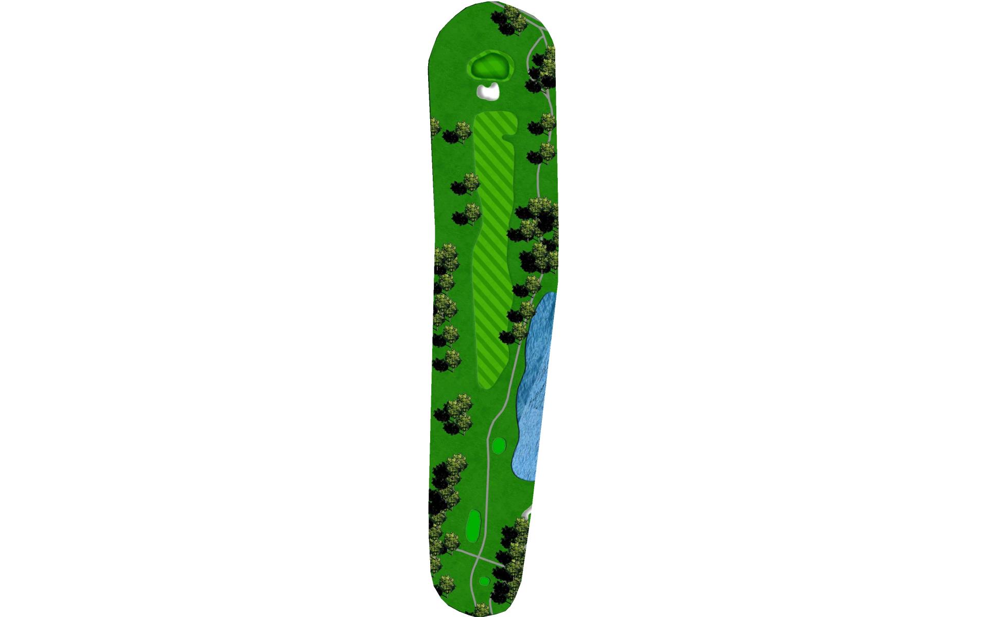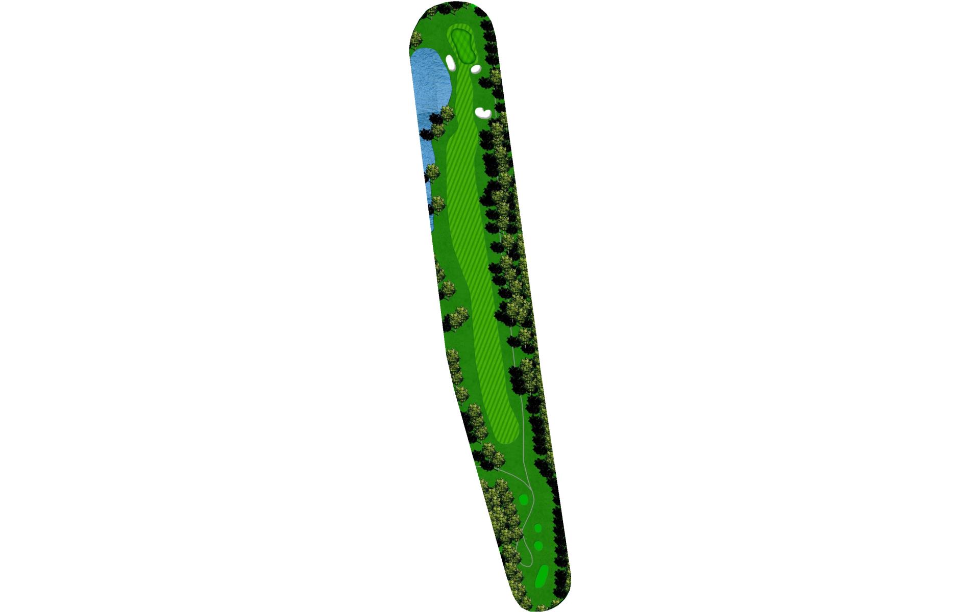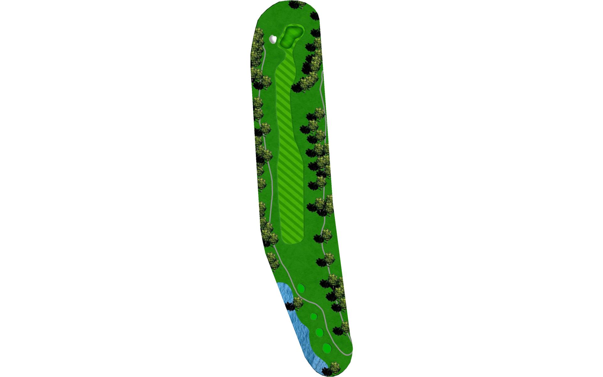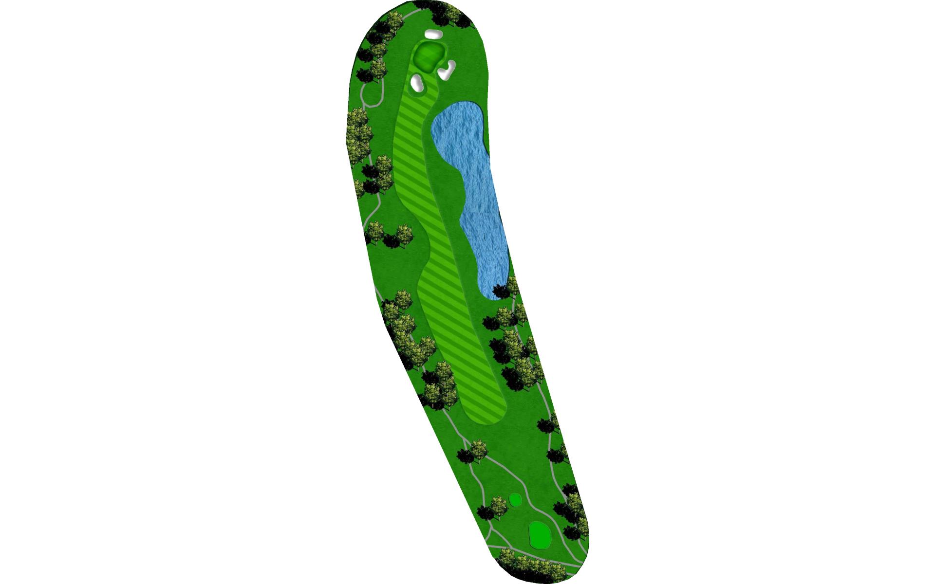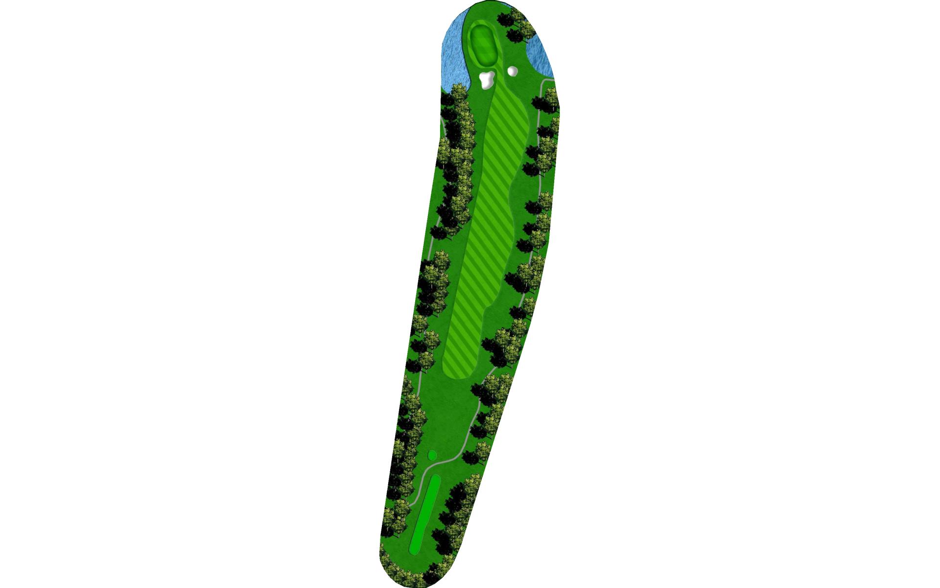 This narrow par 5 has a penalty area down the entire right side. An errant tee shot leaves a difficult layup. Big hitters can reach into two but must avoid the penalty area left and bunkers front left and right.