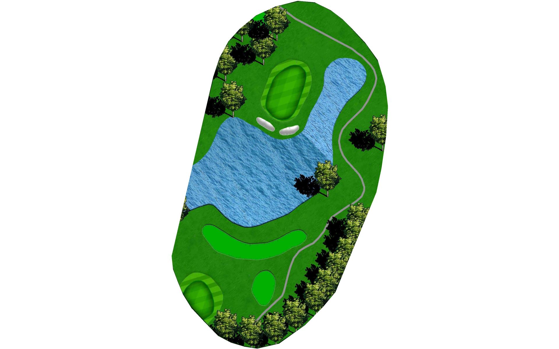 Dogleg right par 4 with a large penalty area on the right starting in the landing area up to the green. Out of Bounds off the tee and approach shot to the left. Green is elevated and small with a bunker in front.