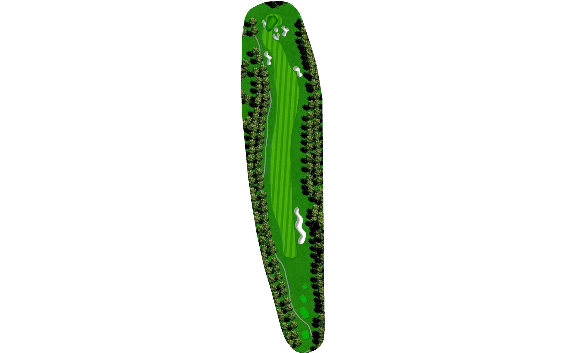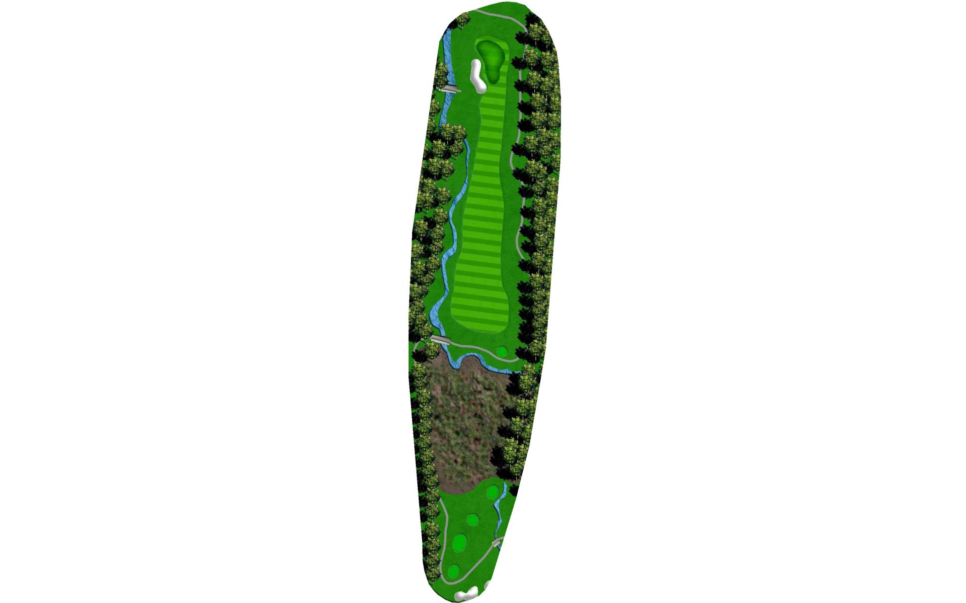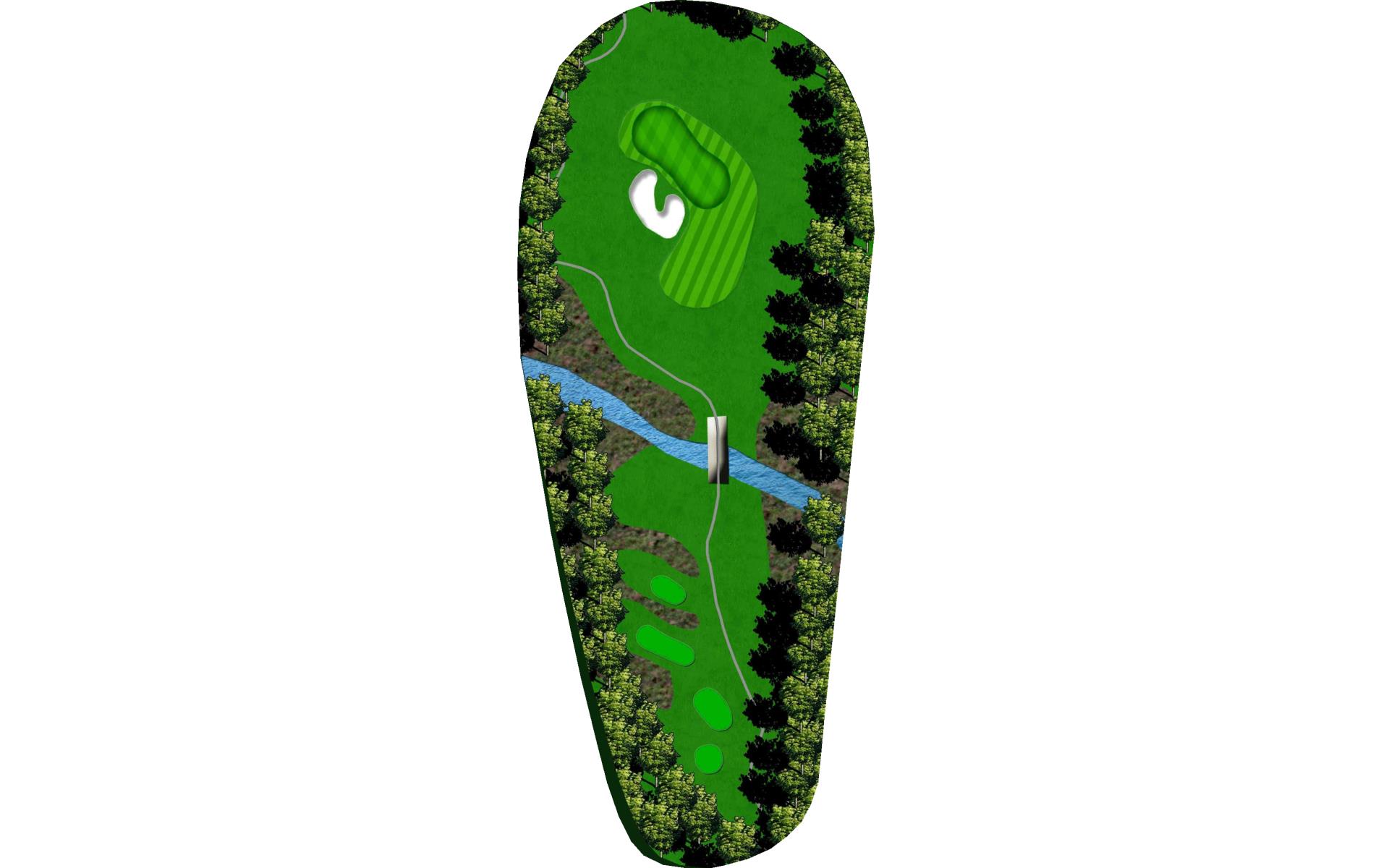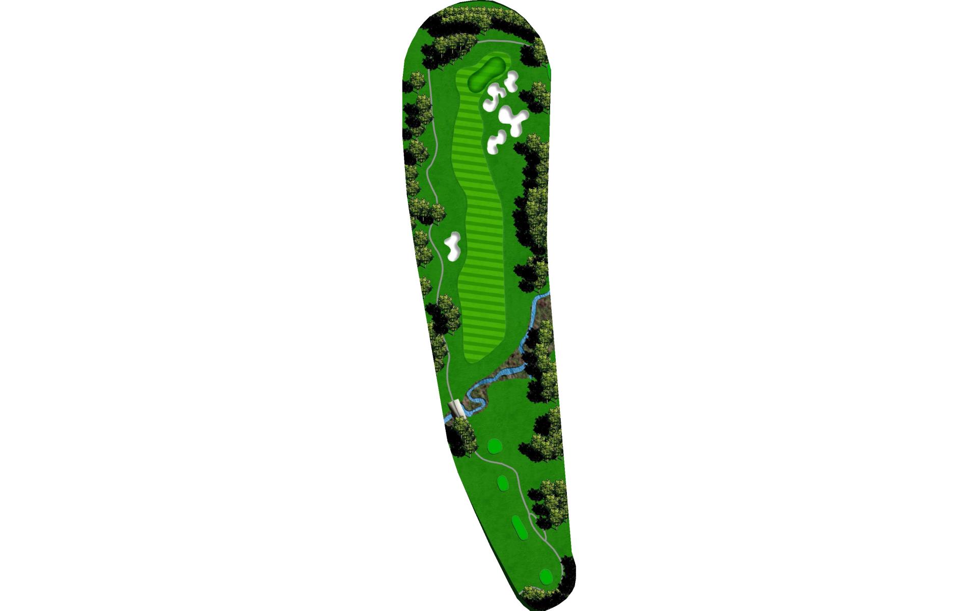 This dog leg requires a long-iron or 3-wood shot to make it to the corner. You don't want to go through the fairway or you will find the creek, to short and trees will block you out from the green. The green is guarded by a creek that flows in front and down the right side of the green.