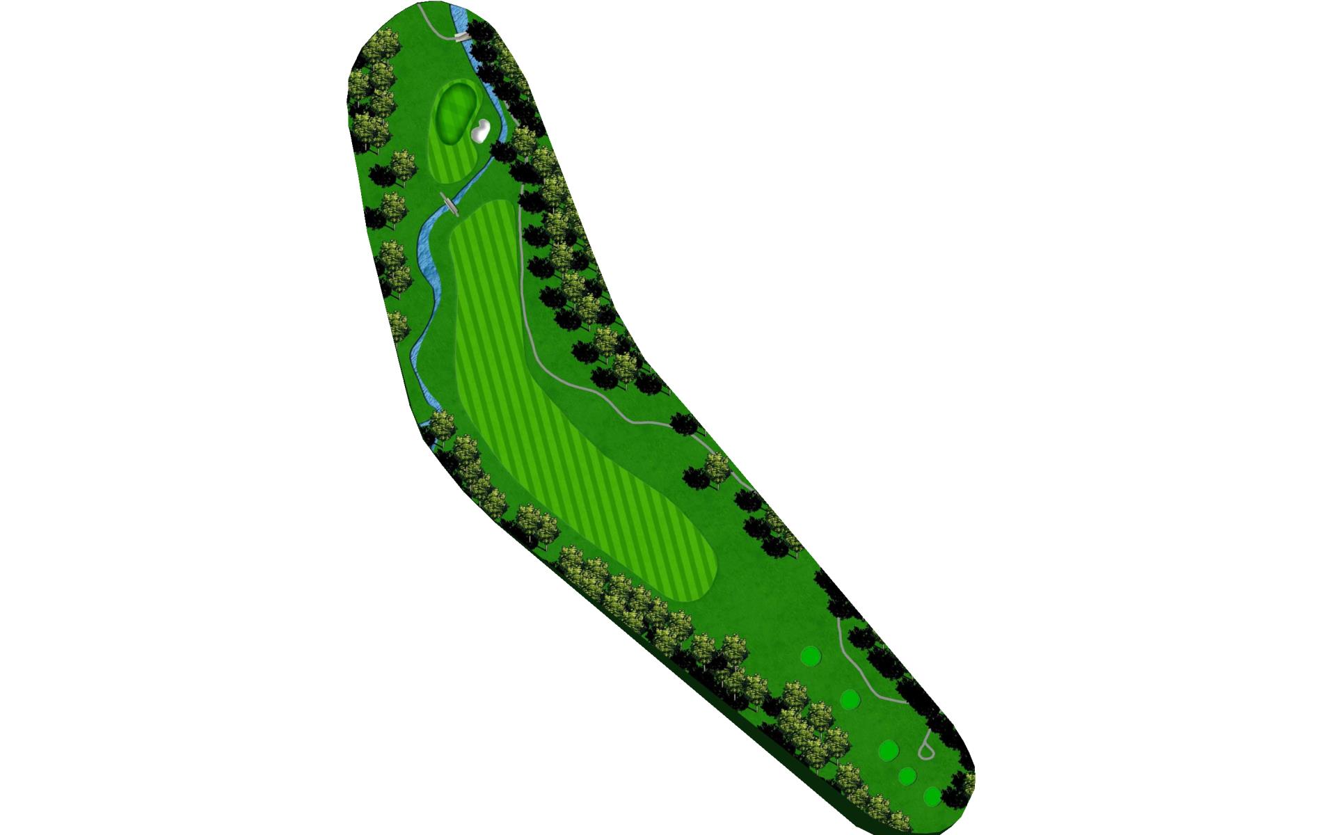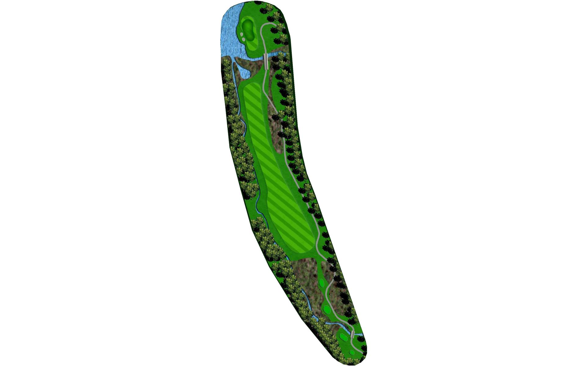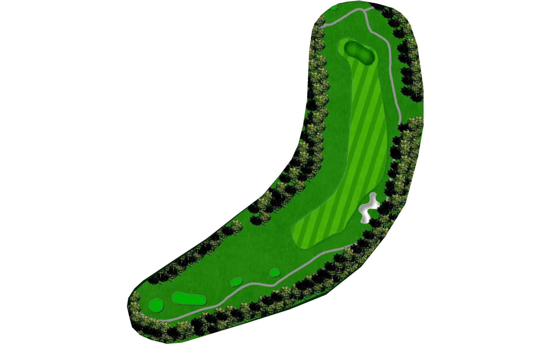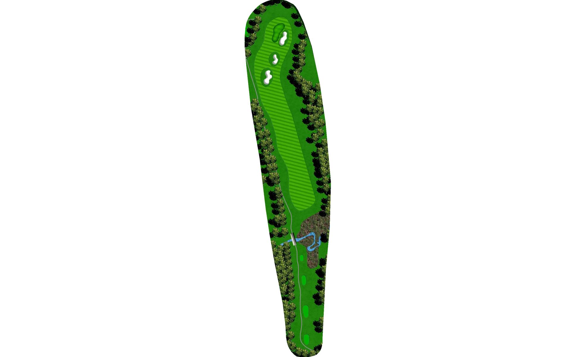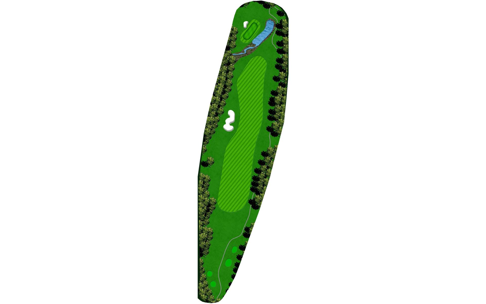 This dog leg requires a long-iron or 3-wood shot to make it to the corner. You don't want to go through the fairway or you will find the creek, to short and trees will block you out from the green. The green is guarded by a creek that flows in front and down the right side of the green.