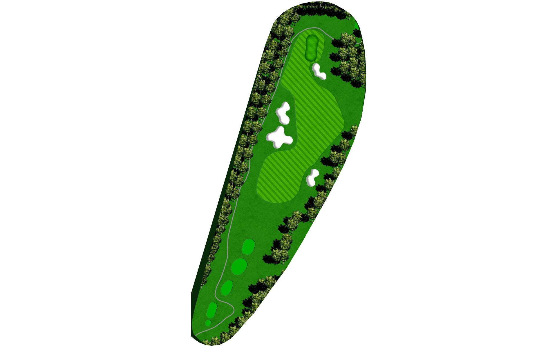 This tee carries over a large valley to a green set into a side hill. The green is protected by a deep bunker on the left and false front landing area. Long is the most desirable bailout area.