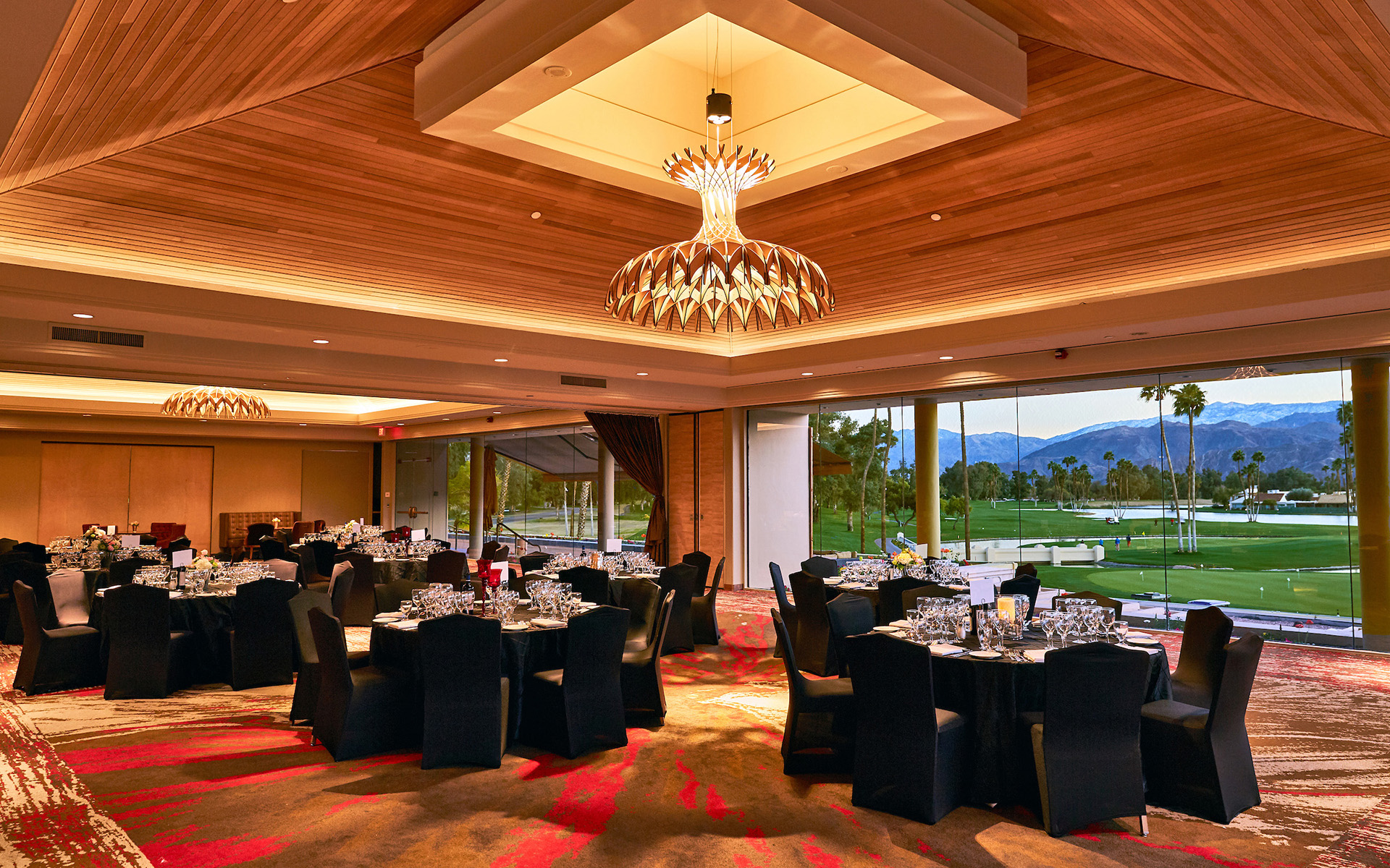 Floor-to-ceiling windows with panoramic views of the San Jacinto and Santa Rosa Mountains is the focus in this room. Accommodates up to 90 guests with Mission Hills Country Club lounge chairs, 110 with banquet chairs.