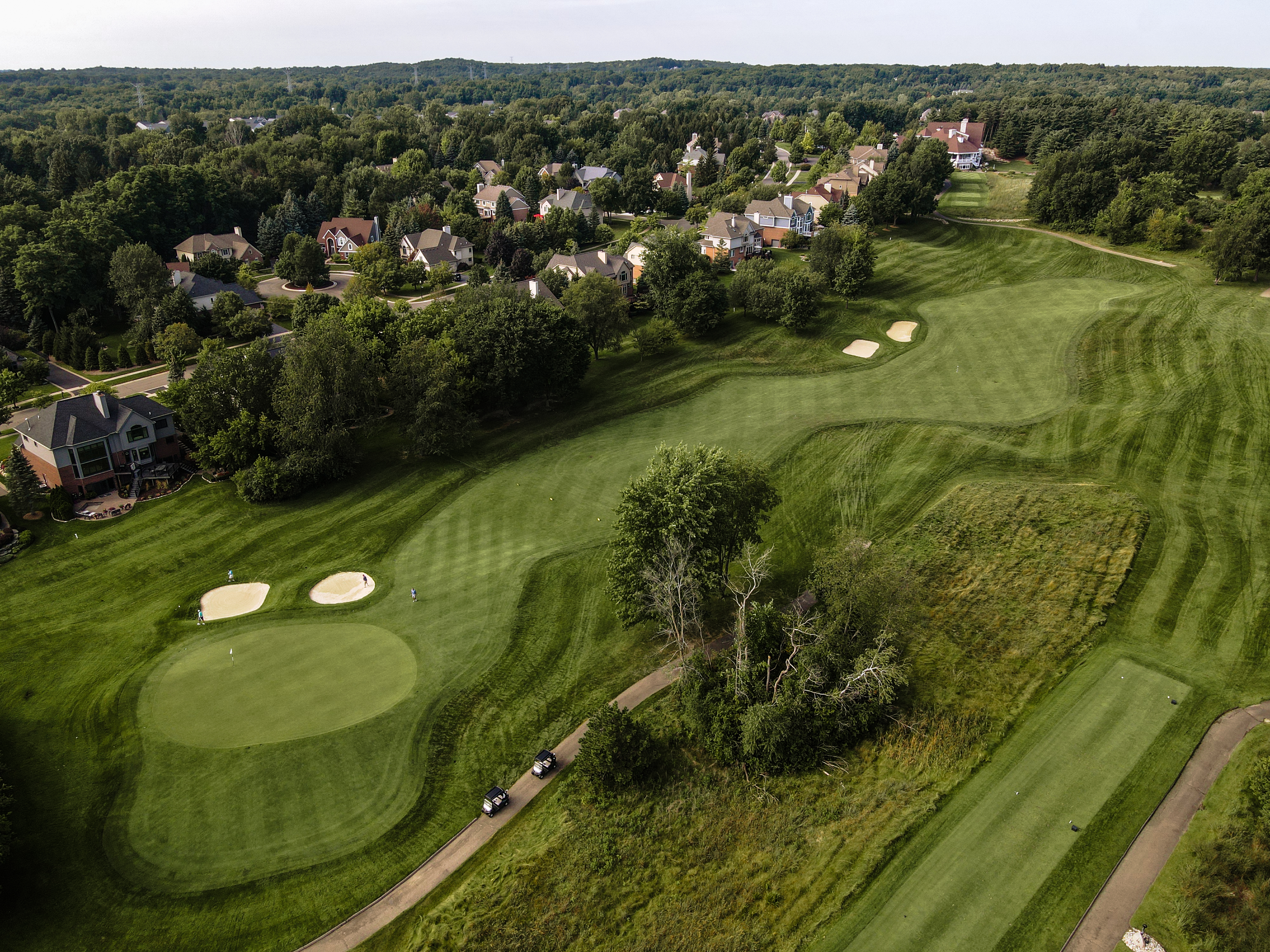 A long fade drive just over the right side of the large oak on the left will run down the hill. Too far right brings back yard unplayable out of bounds into threat. Without a crushing second shot the smart play is a lay-up just beyond the rock ridges for a short iron into a wide, shallow green. A significant landing beyond the marsh in front of the green is hidden from view. Long and over the green will probably be gone. The green slopes more left to right but also slopes back to front.