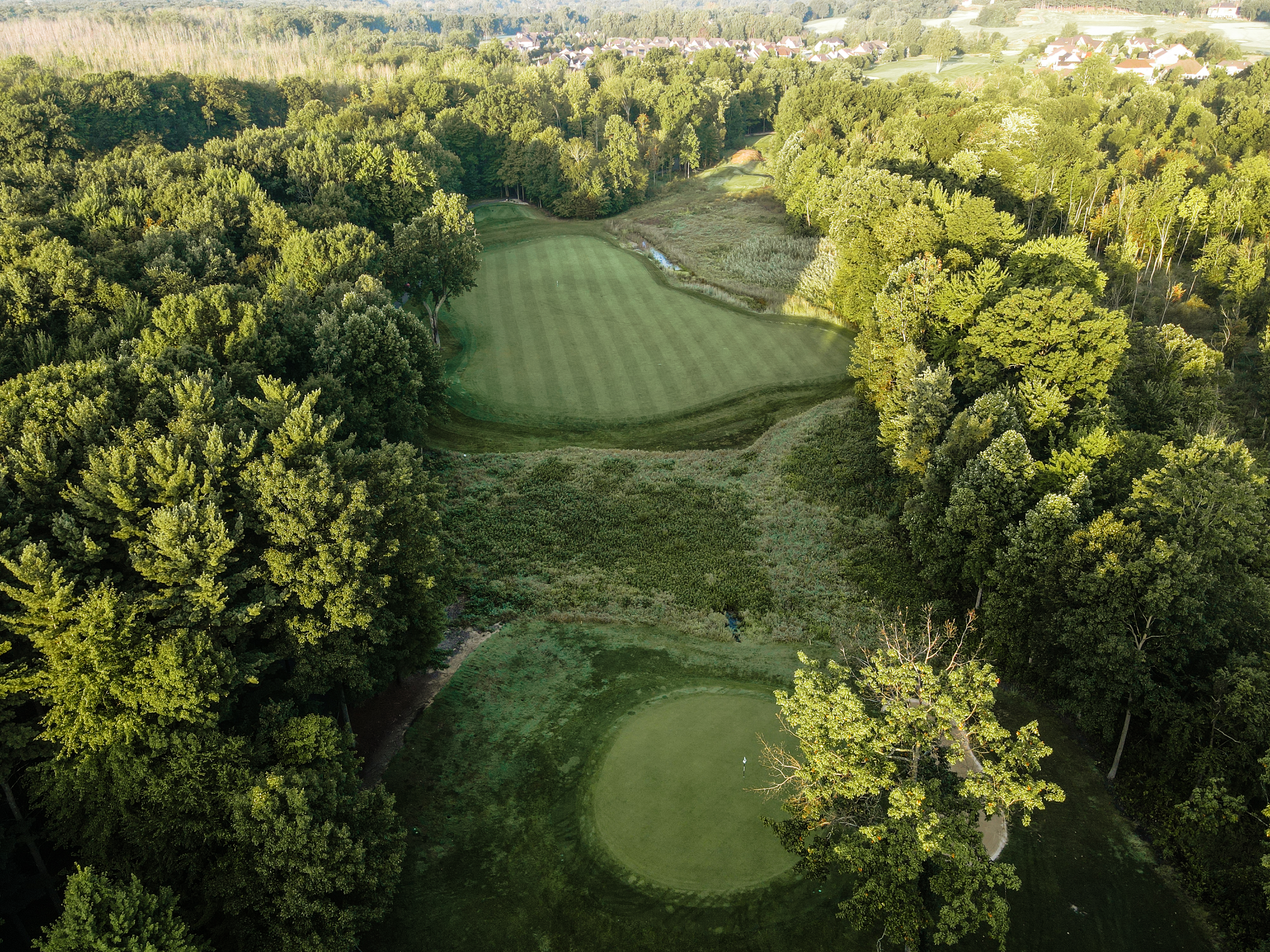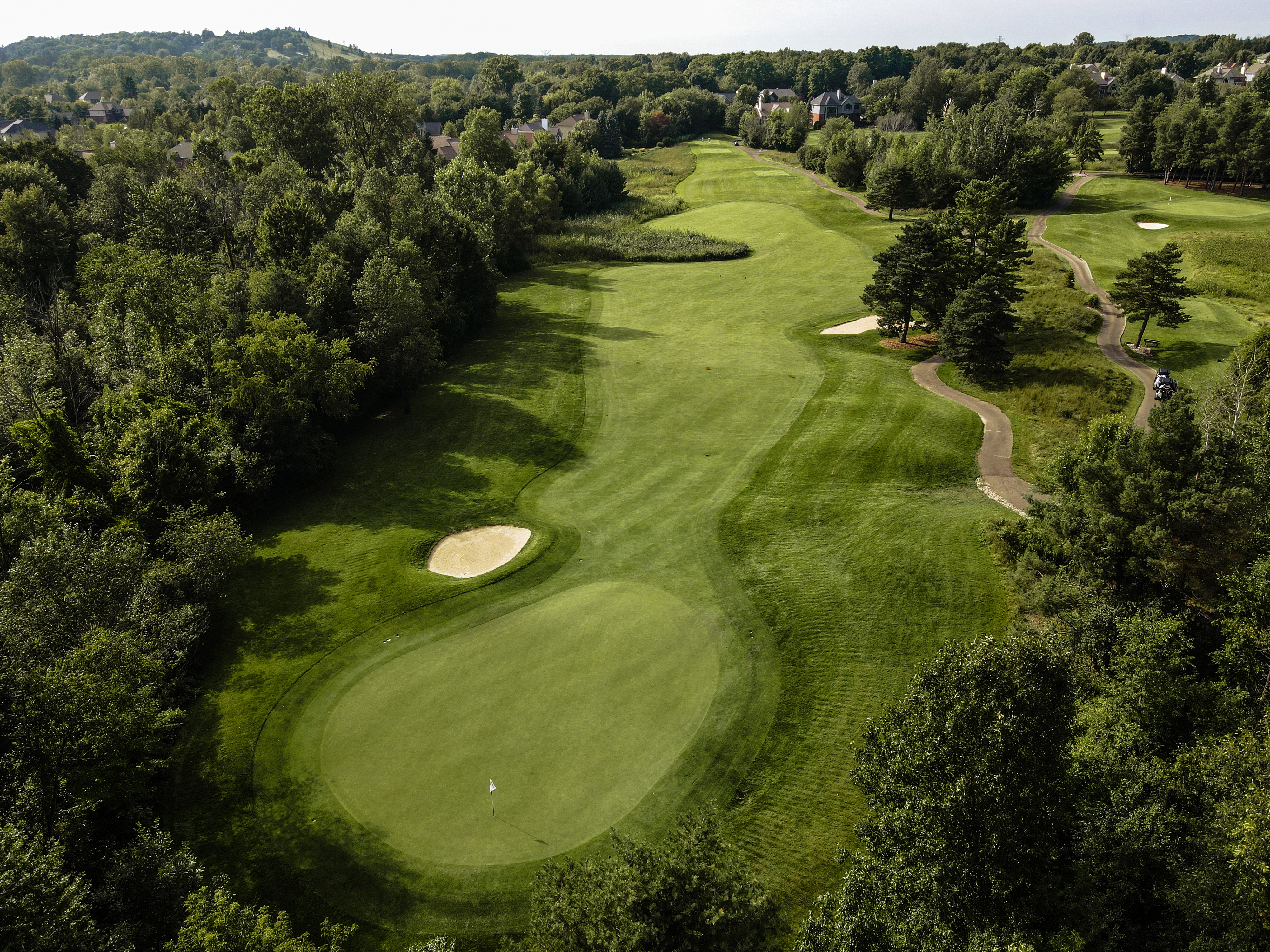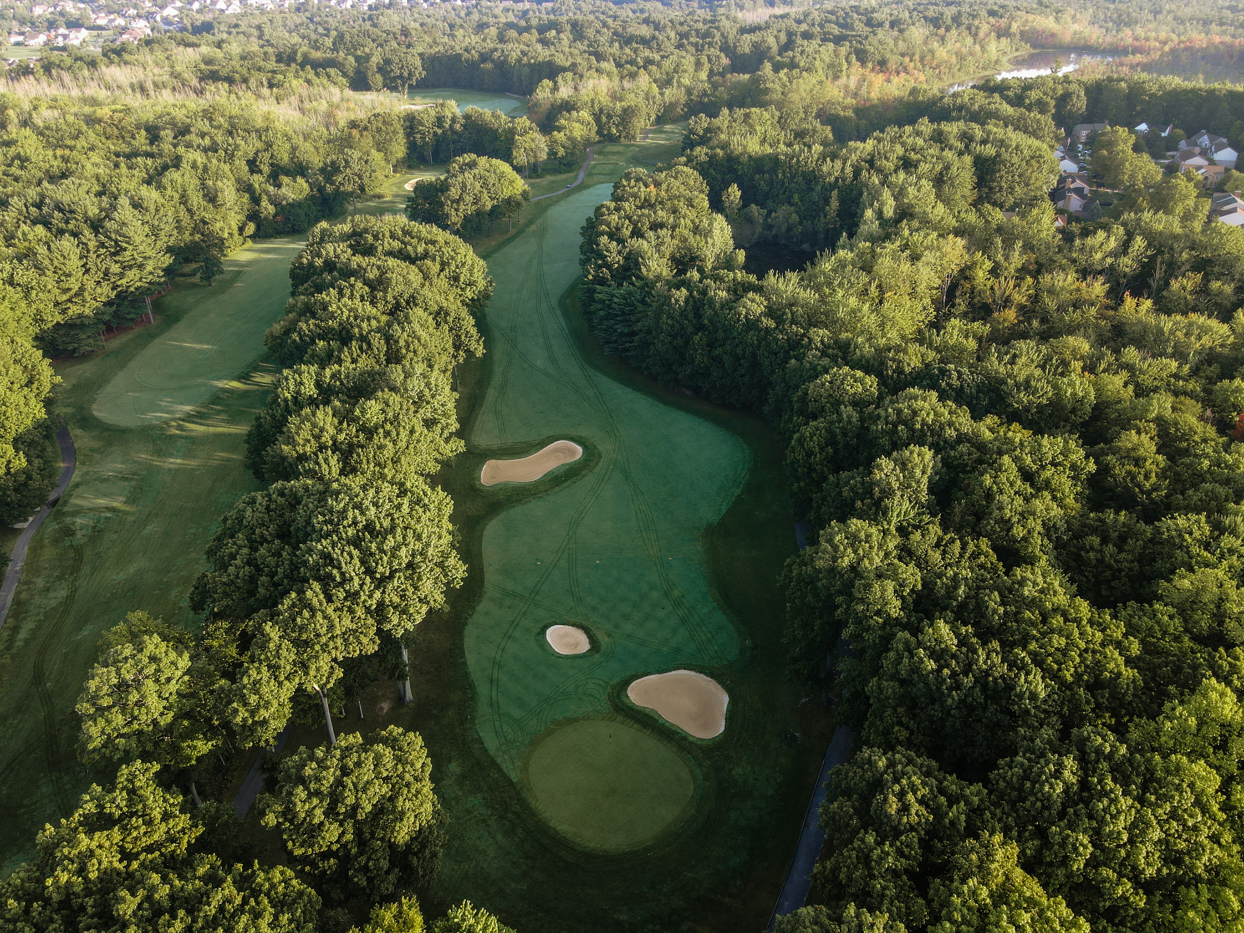 The gap between the last tree on the left and the wide sand bunker in the center of the hole begs for a 210-yard carry to the 150-yard stake, leaving a second shot over a deep, hidden grass bunker and a deep pot sand bunker on the right front corner of this small, right to left sloping green. A long carry straight ahead will put you perfectly placed with a 150-yard straight carry into the flag. A large landing area sits behind and left of the green.