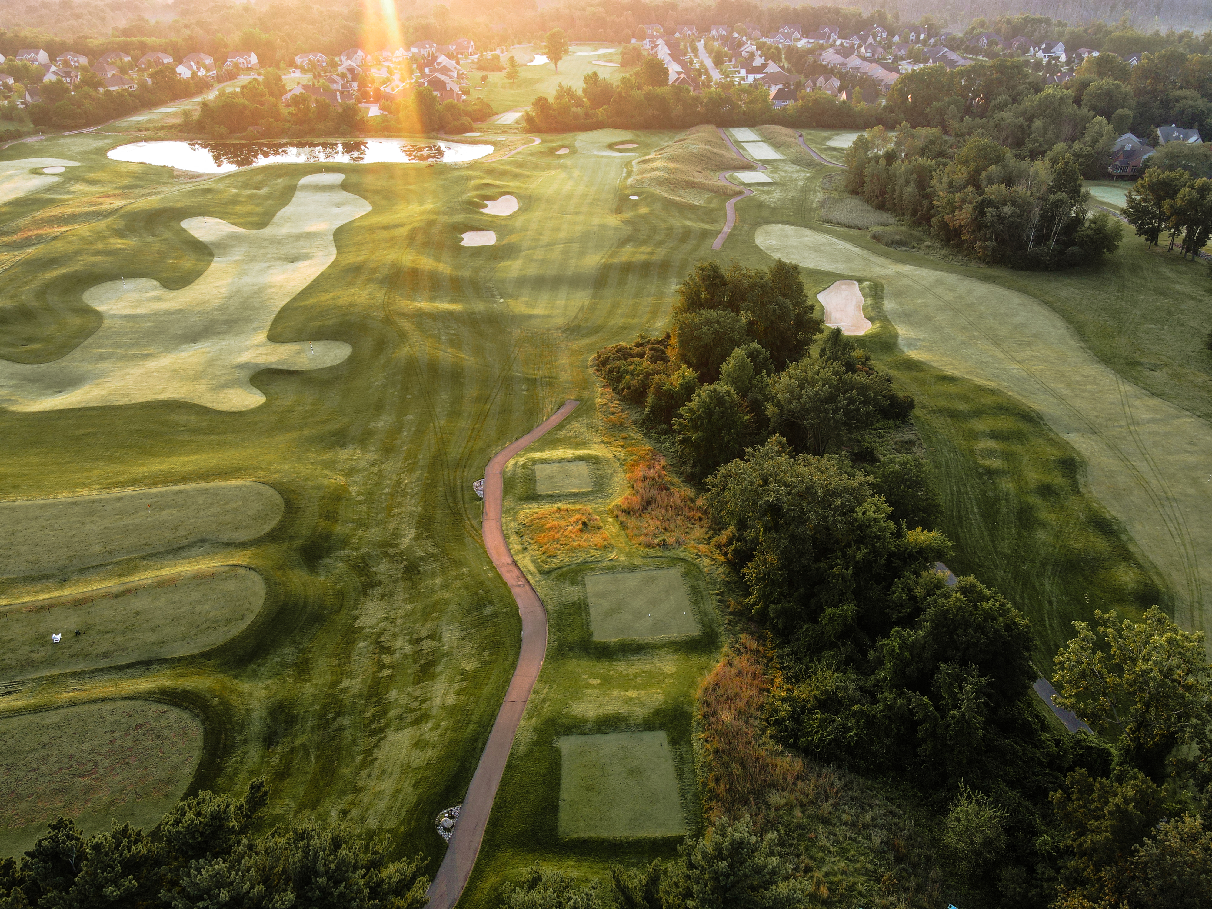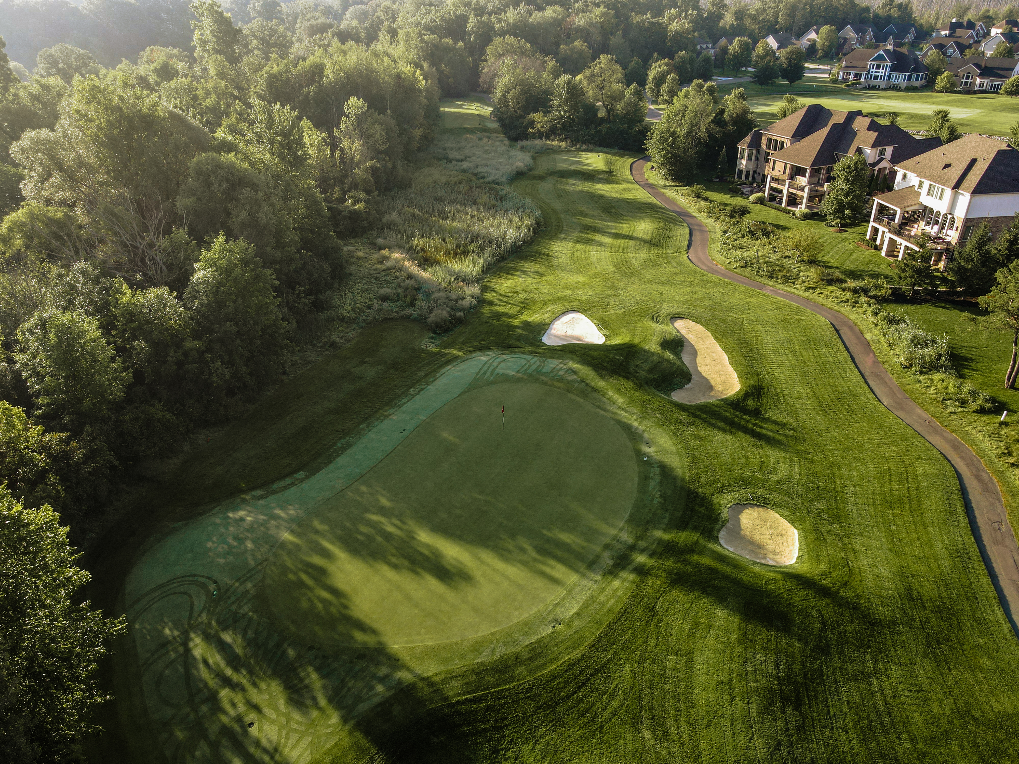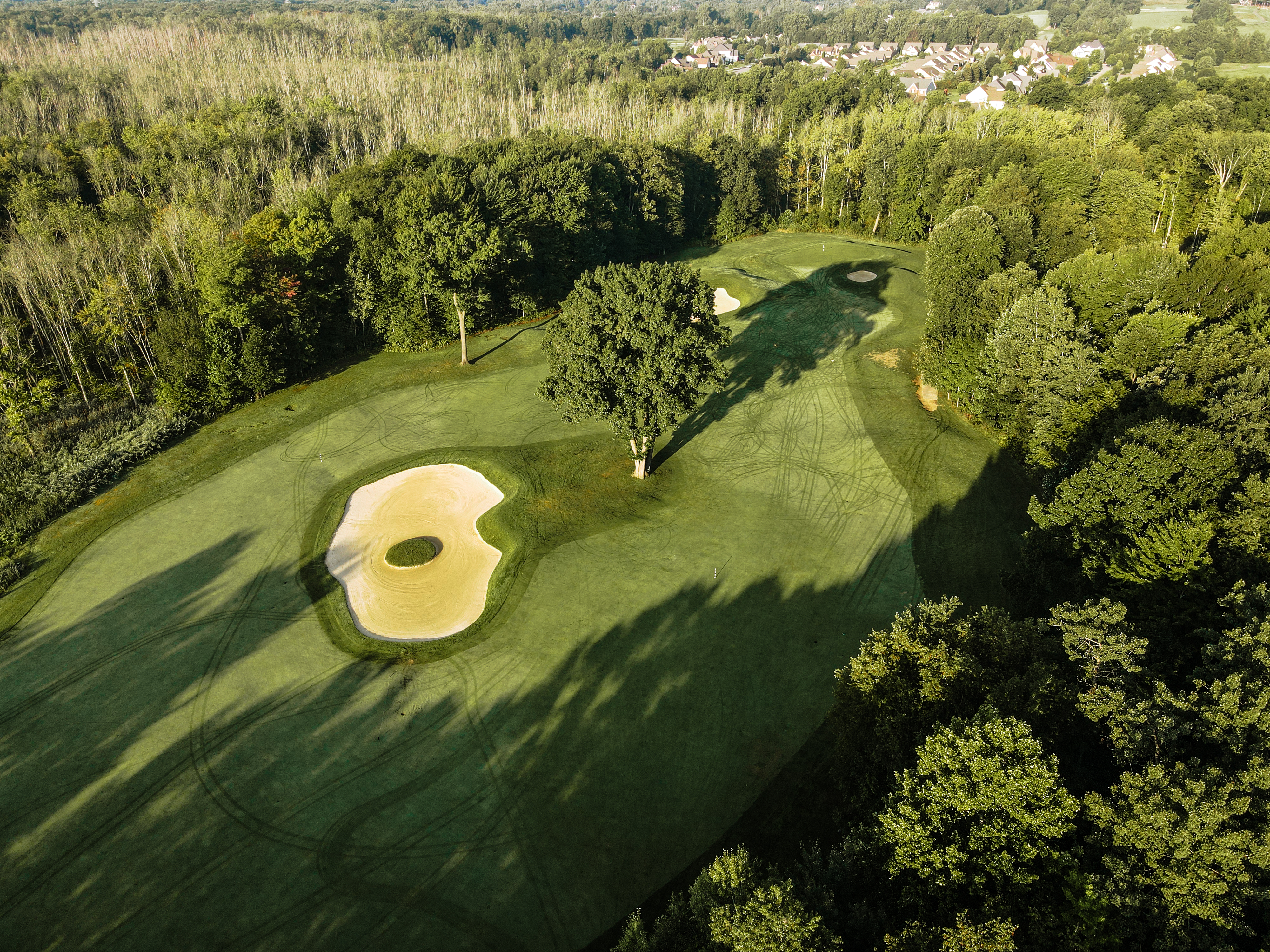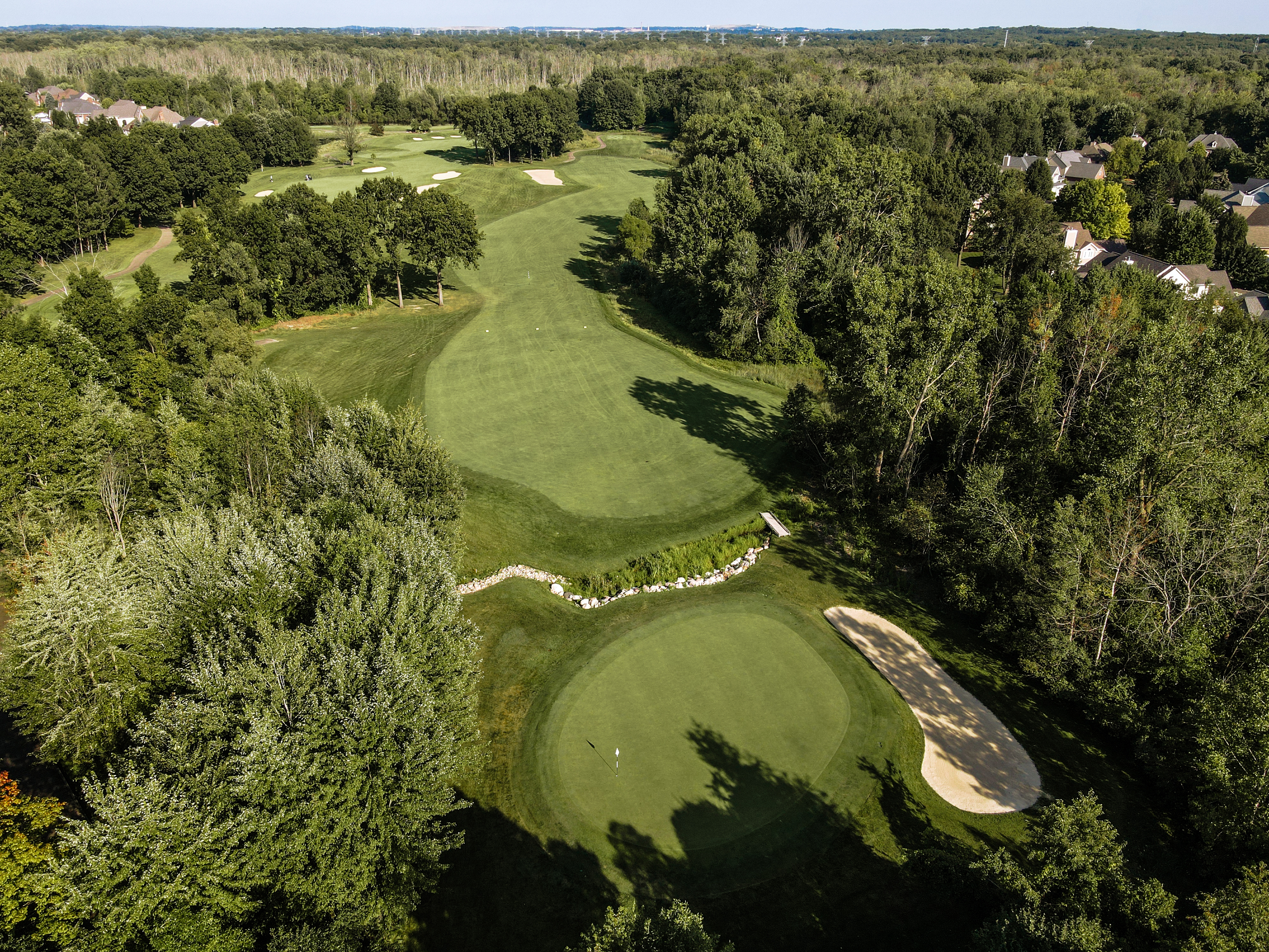 The gap between the last tree on the left and the wide sand bunker in the center of the hole begs for a 210-yard carry to the 150-yard stake, leaving a second shot over a deep, hidden grass bunker and a deep pot sand bunker on the right front corner of this small, right to left sloping green. A long carry straight ahead will put you perfectly placed with a 150-yard straight carry into the flag. A large landing area sits behind and left of the green.