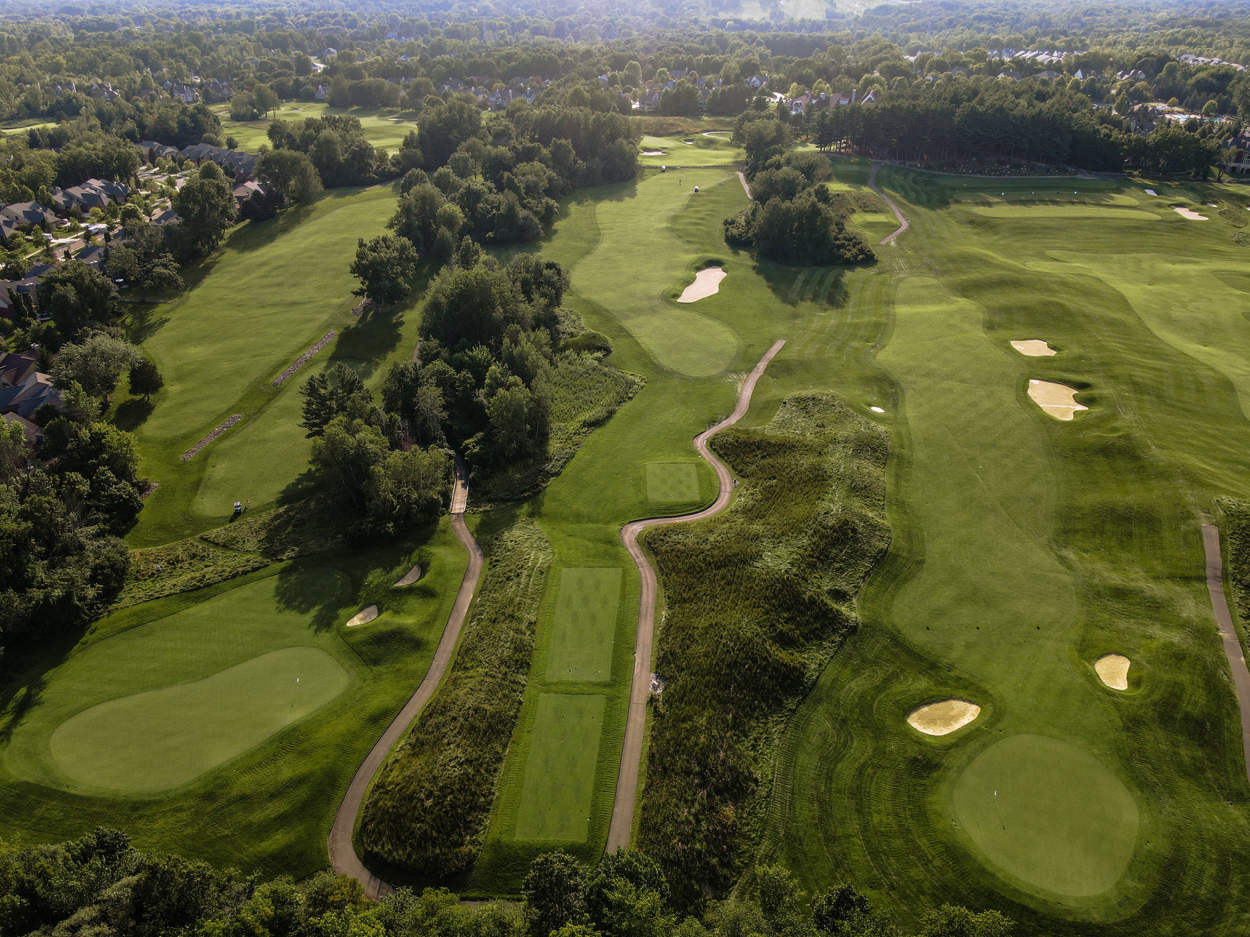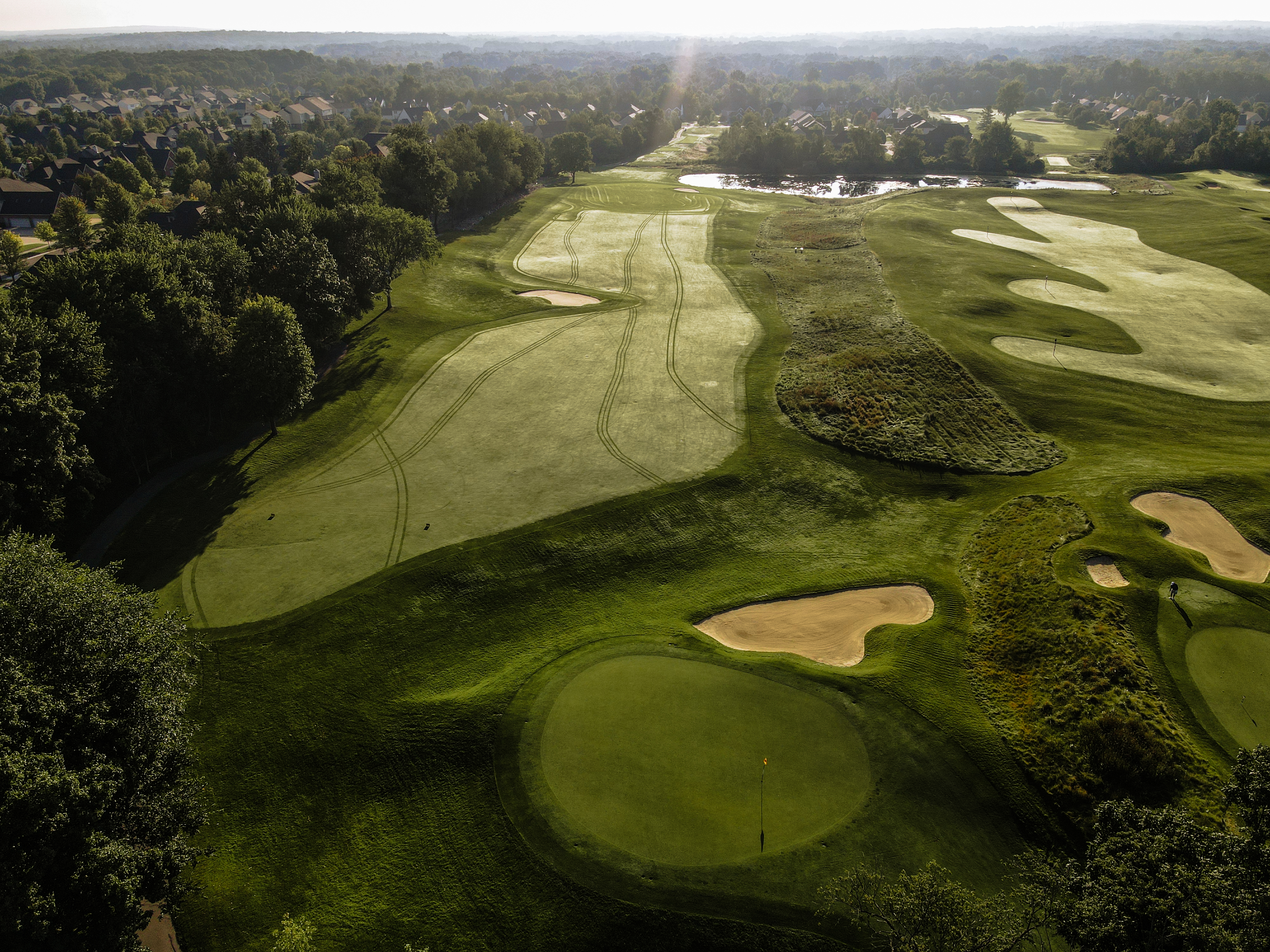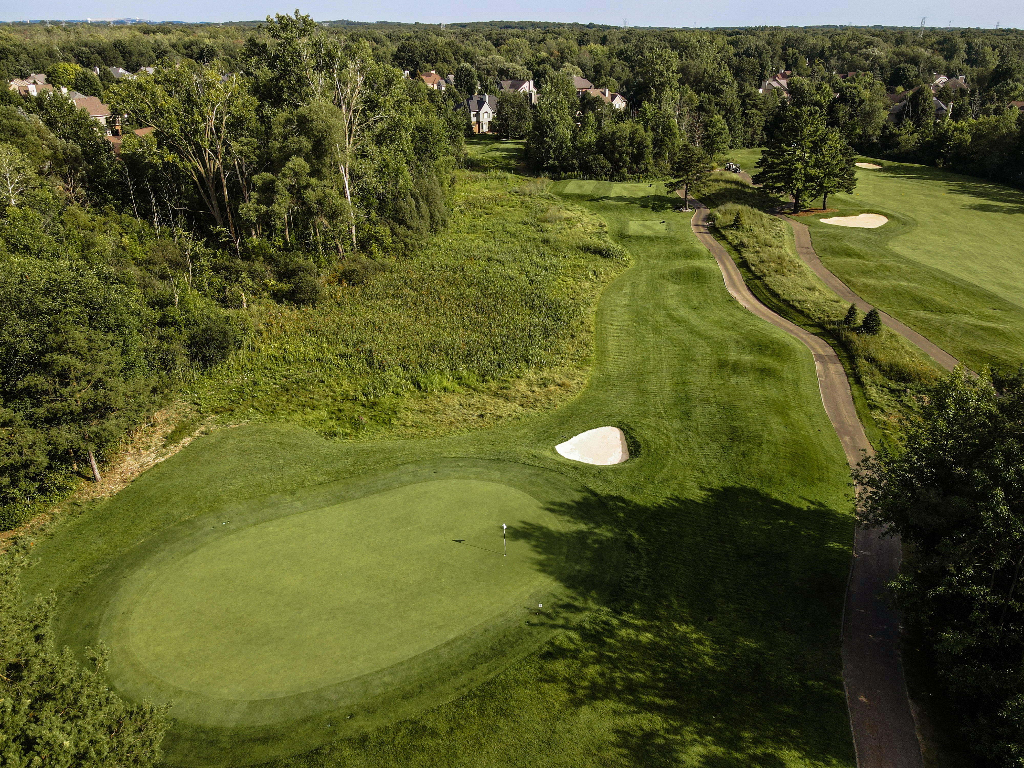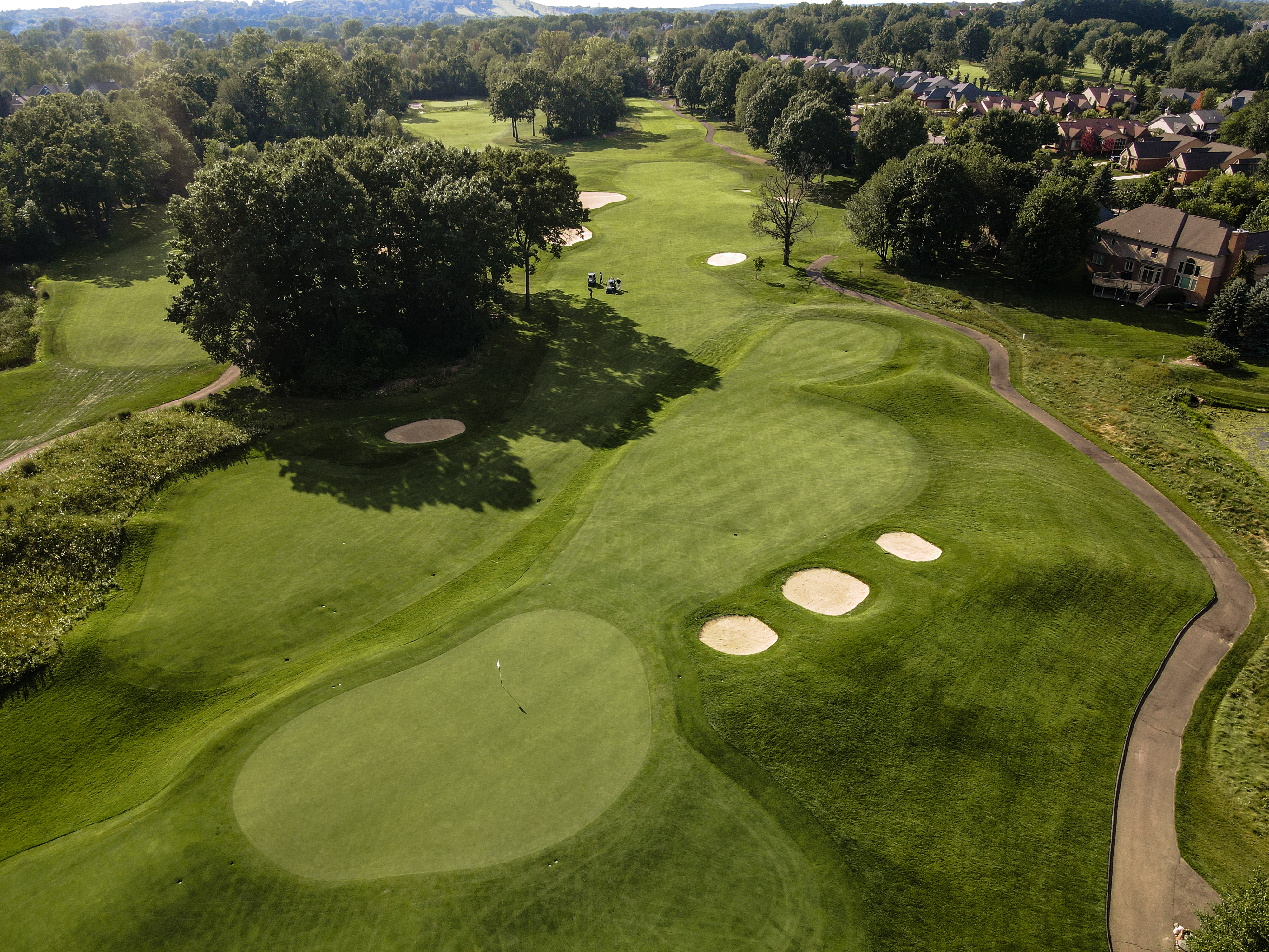 Avoid the fairway bunkers on the left. The fairway opens up to the right beyond last ridge up near the green. The green slopes from front towards the middle and there is a collection area off the back left corner.