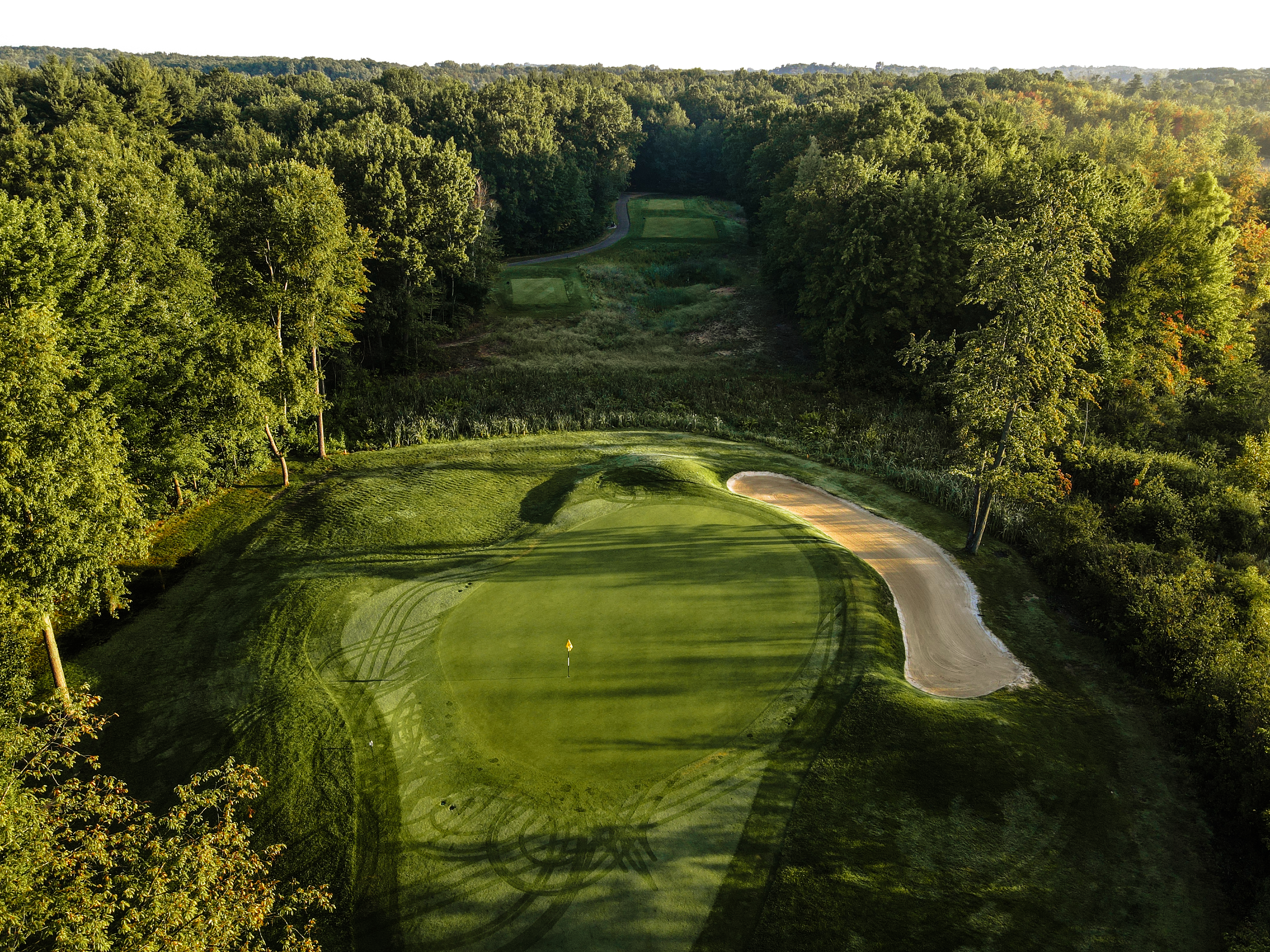 A long, narrow sand bunker follows the left side of the green. A large landing area lies behind the tree line to the right, and the green falls away off the back of the green.