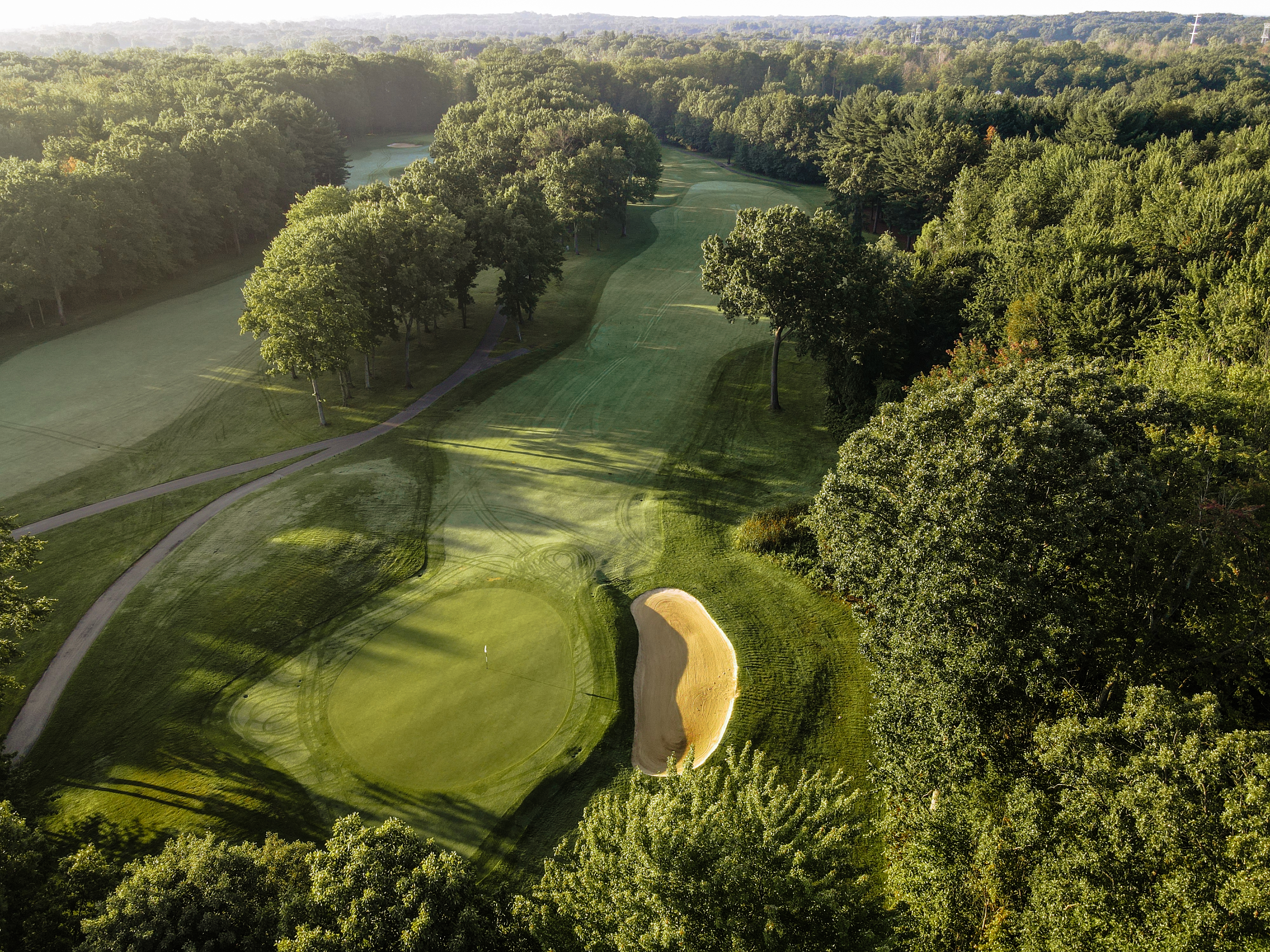 A 230-yard drive to the 150 stake is the best safe play, but Members and those with courage aim over the right hand bunkers for extra run off the back side of the hill. Out of bounds is a threat right. Too long left can bring the hill and potentially the stand of trees into play. The green slopes front to back.
