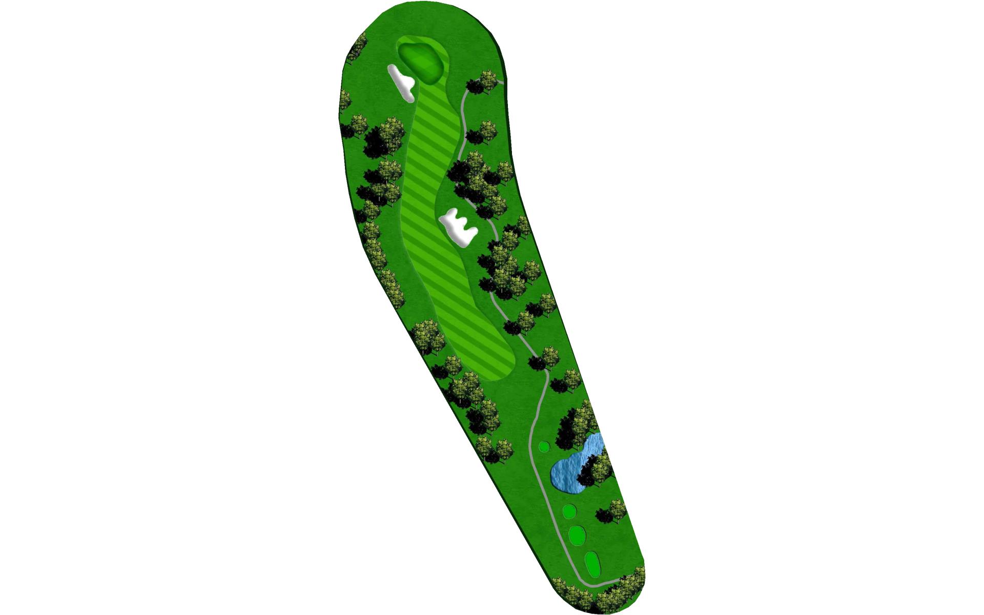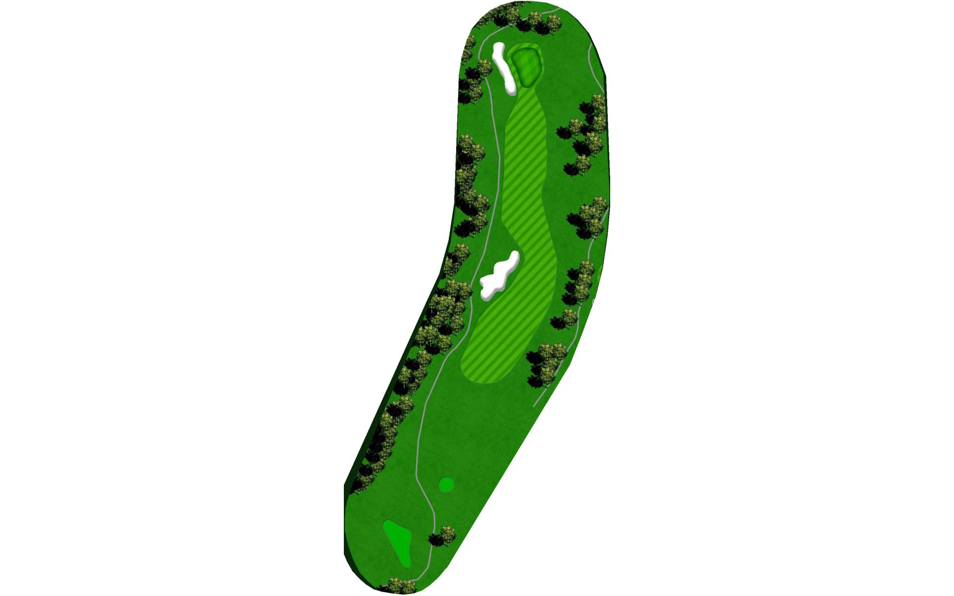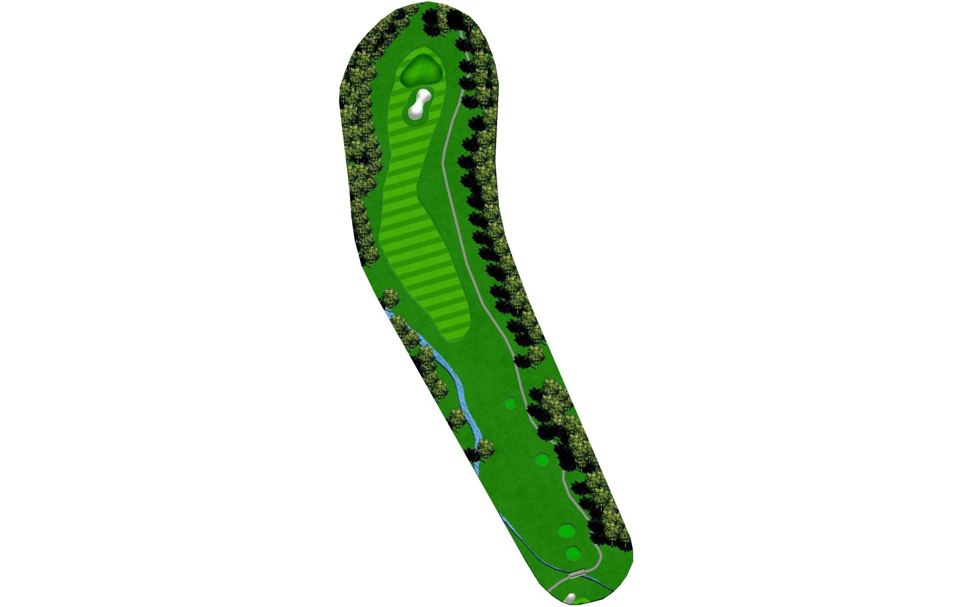 This slight dog leg left requires a precise tee shot that favors the right side of the fairway as the left is protected by trees and a Creek. Most players will have a long Iron in and need to favor the Center Left porton of the green to stay away from the Bunker and Water right of the green. This green as a decent amount of undulation in it so being in the correct section is vital.
