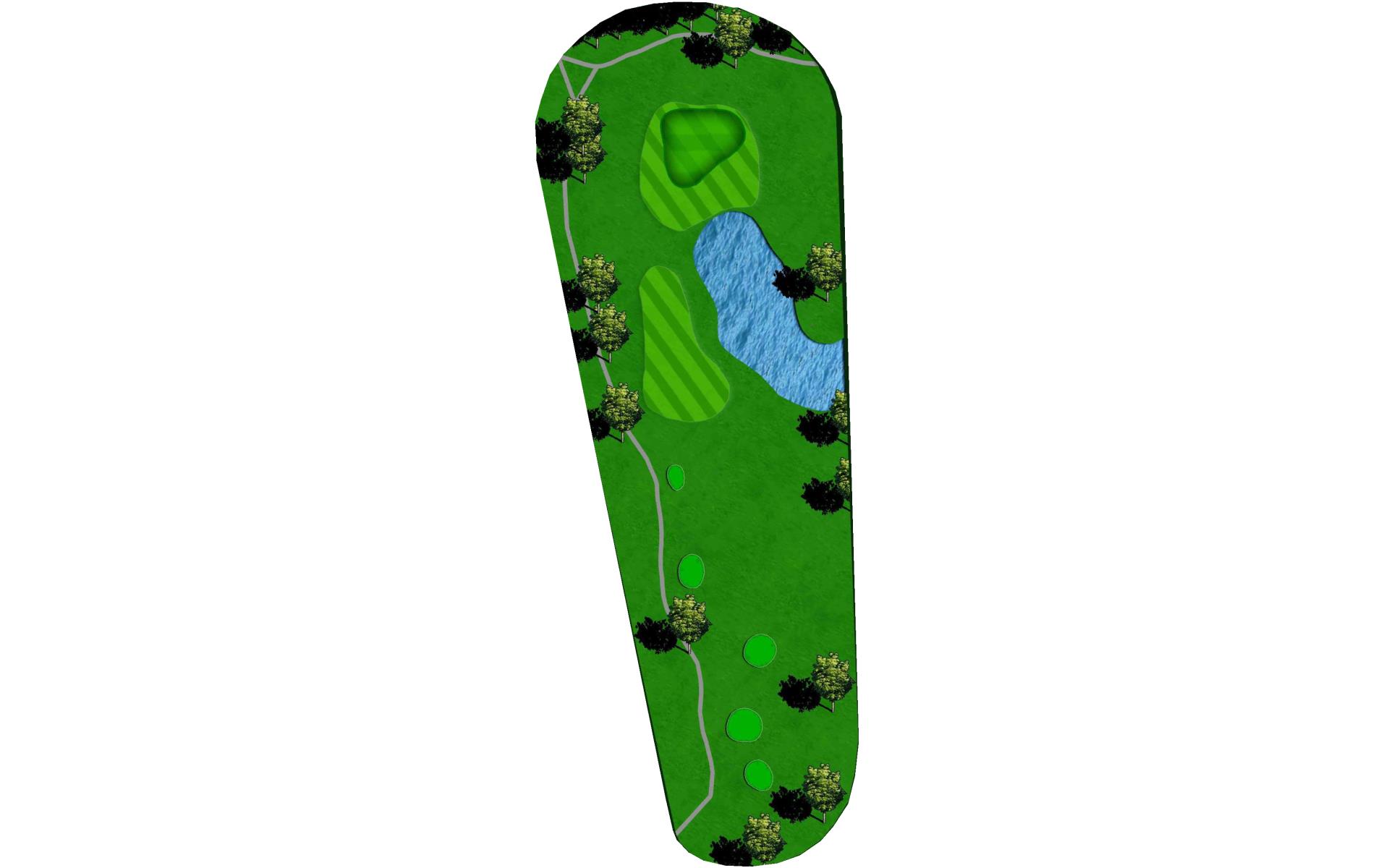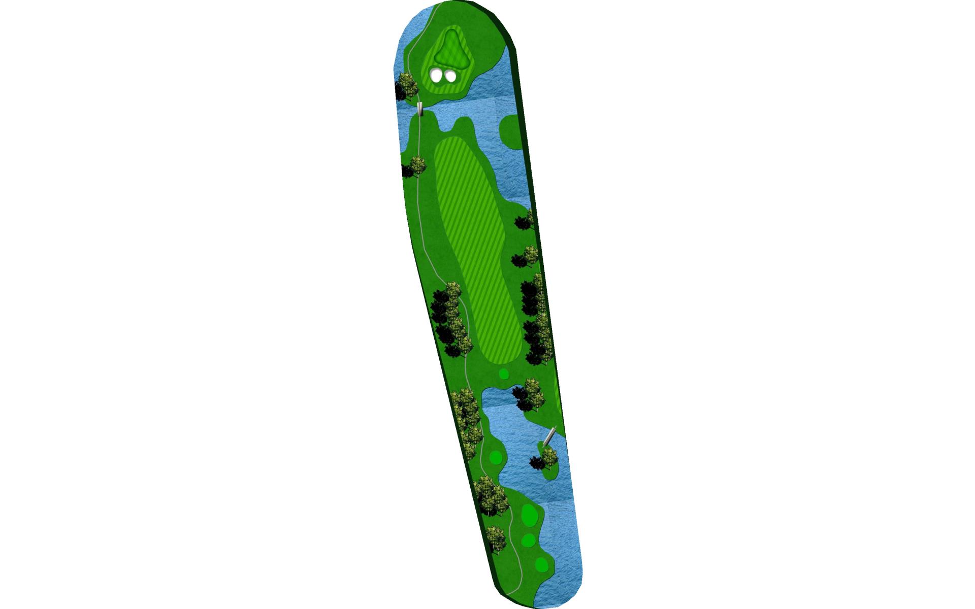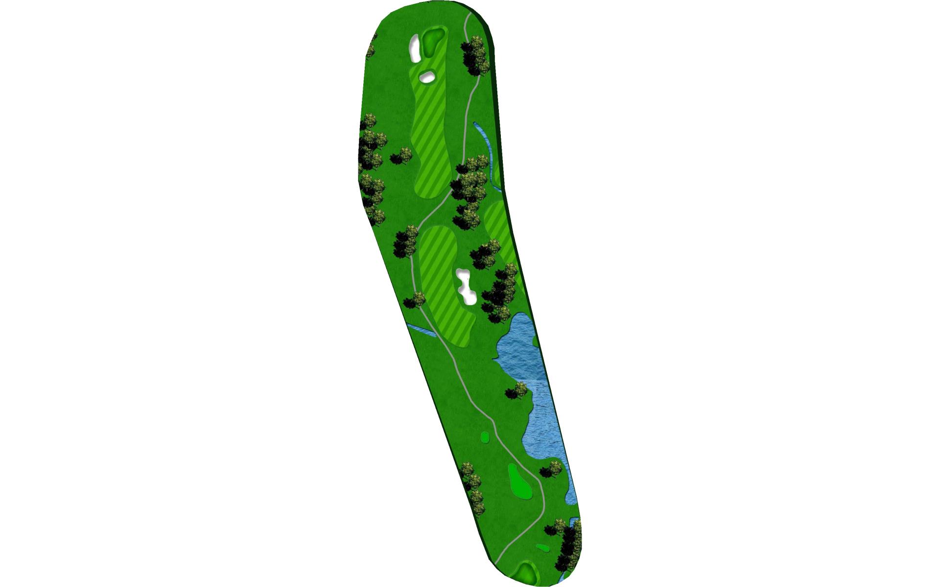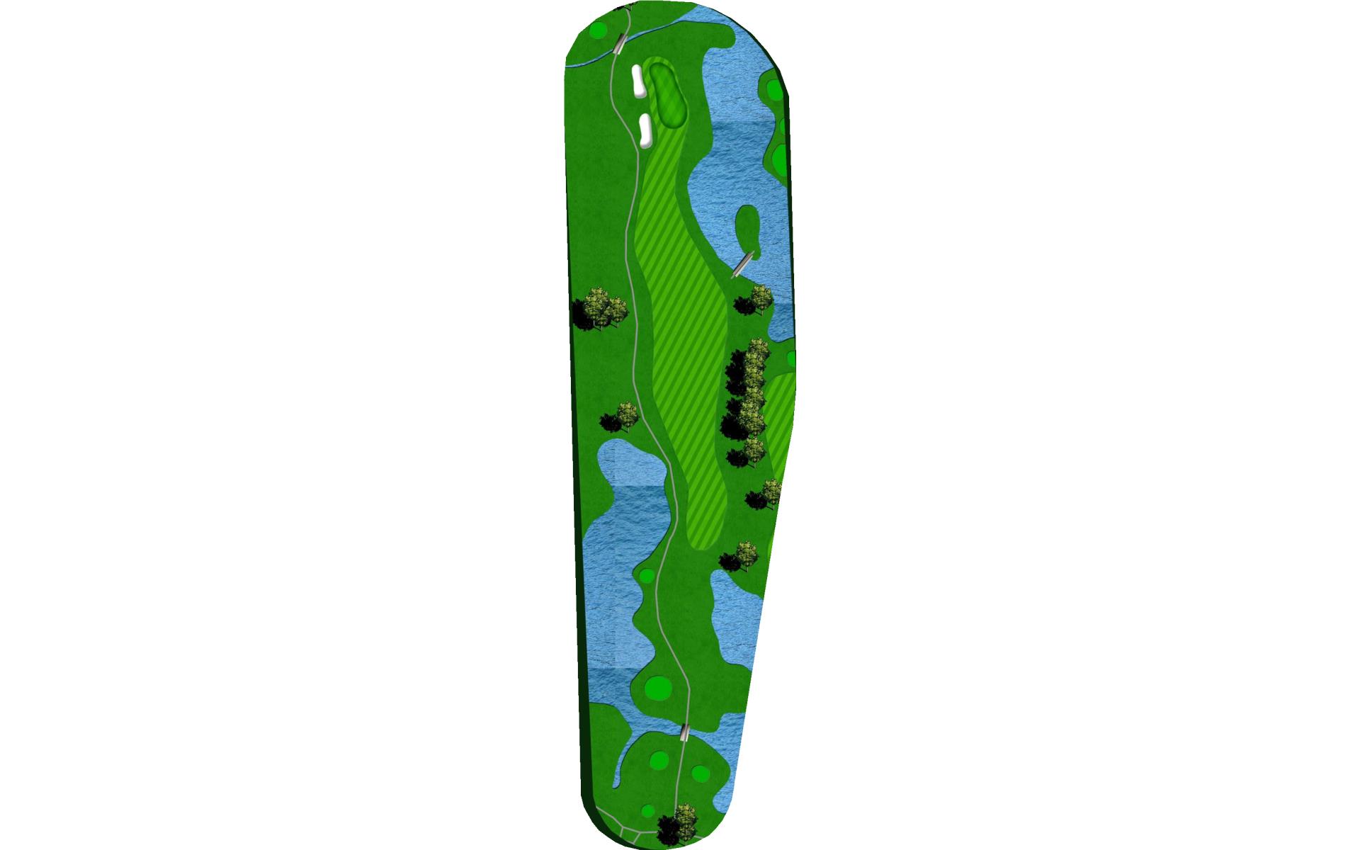 This slight dog leg left requires a precise tee shot that favors the right side of the fairway as the left is protected by trees and a Creek. Most players will have a long Iron in and need to favor the Center Left porton of the green to stay away from the Bunker and Water right of the green. This green as a decent amount of undulation in it so being in the correct section is vital.