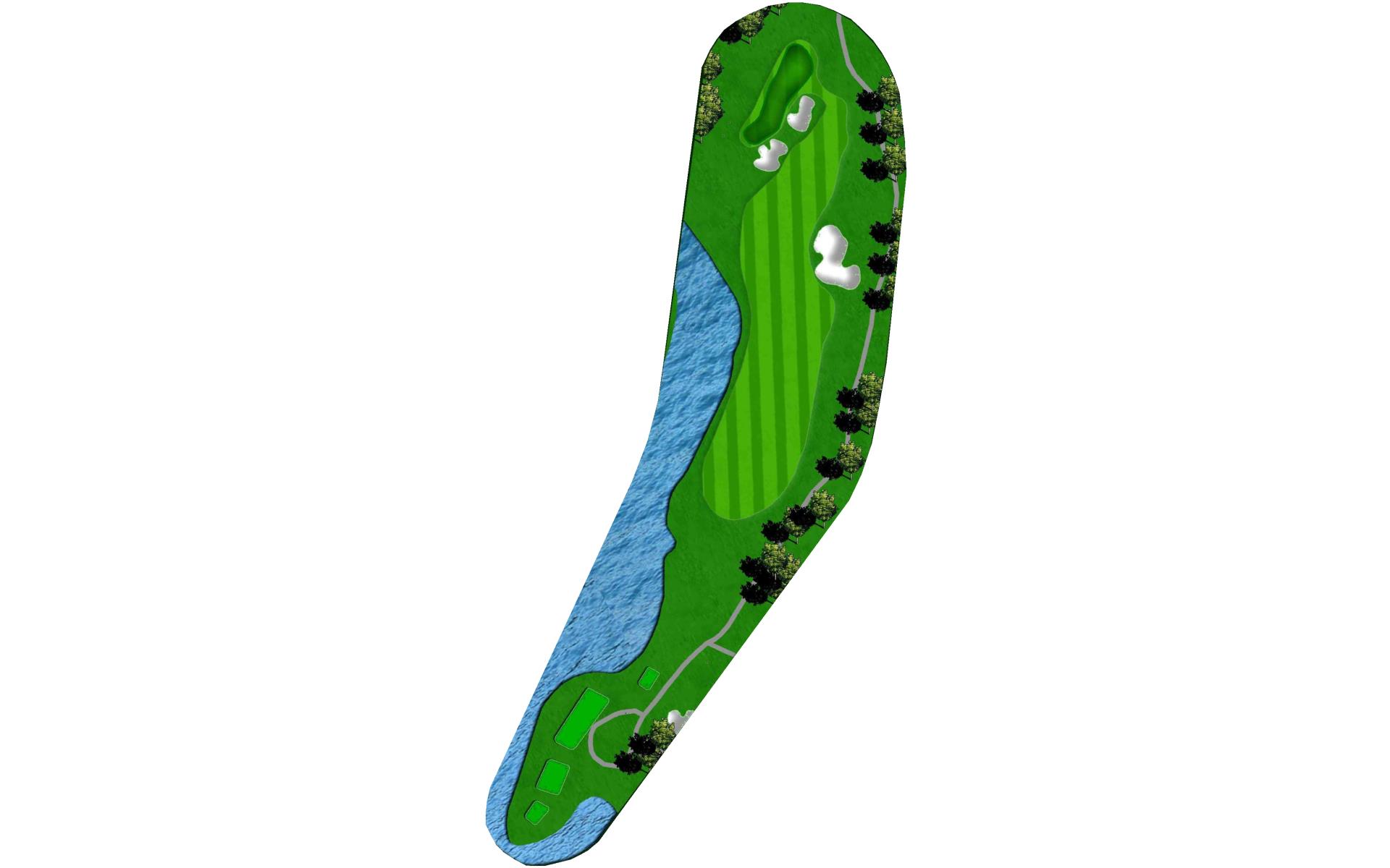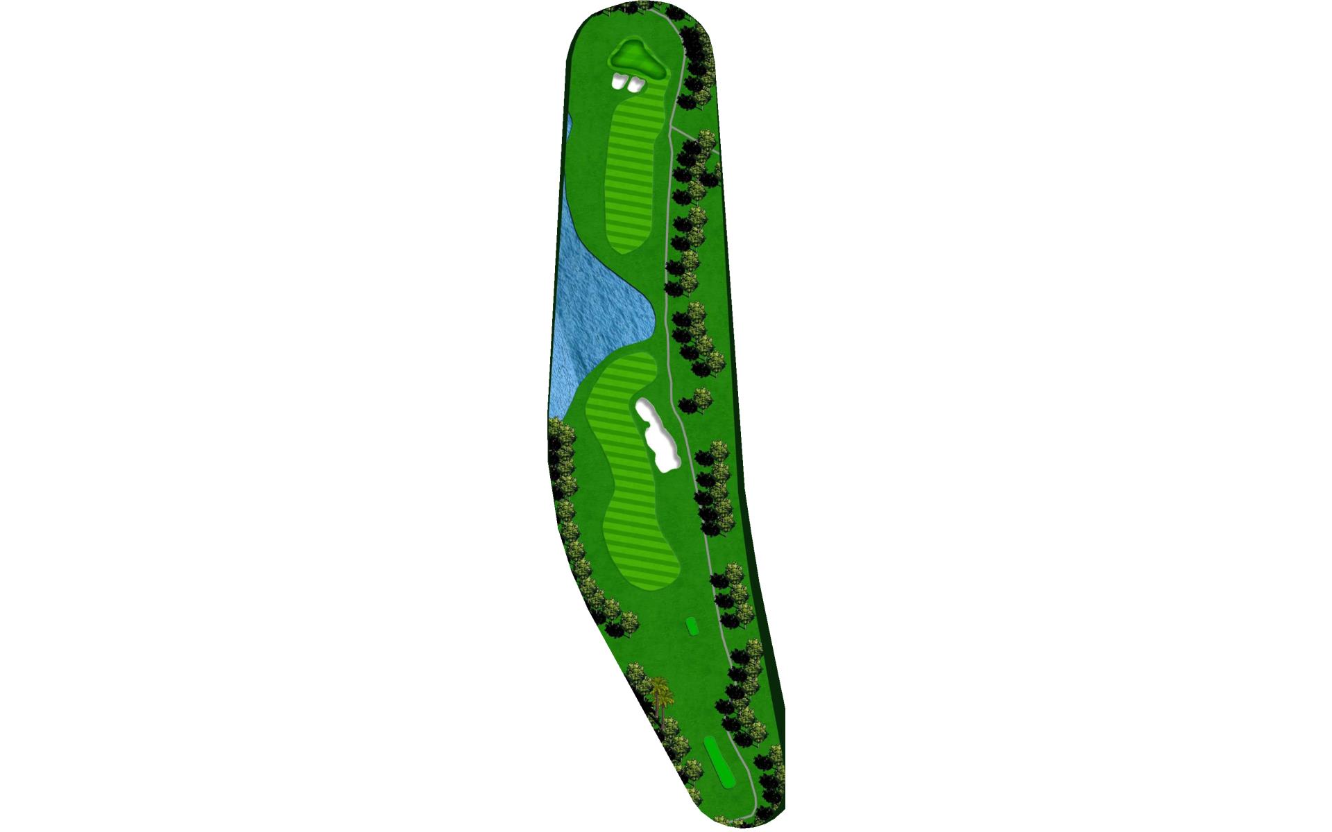 | The final hole on the front nine is a dogleg left par 5 with water left and right off the tee. Similar to the 5th hole, players must choose whether to attack the green after a layup off the tee, or layup again leaving a wedge into a peninsula green surrounded by bunkers and water. |