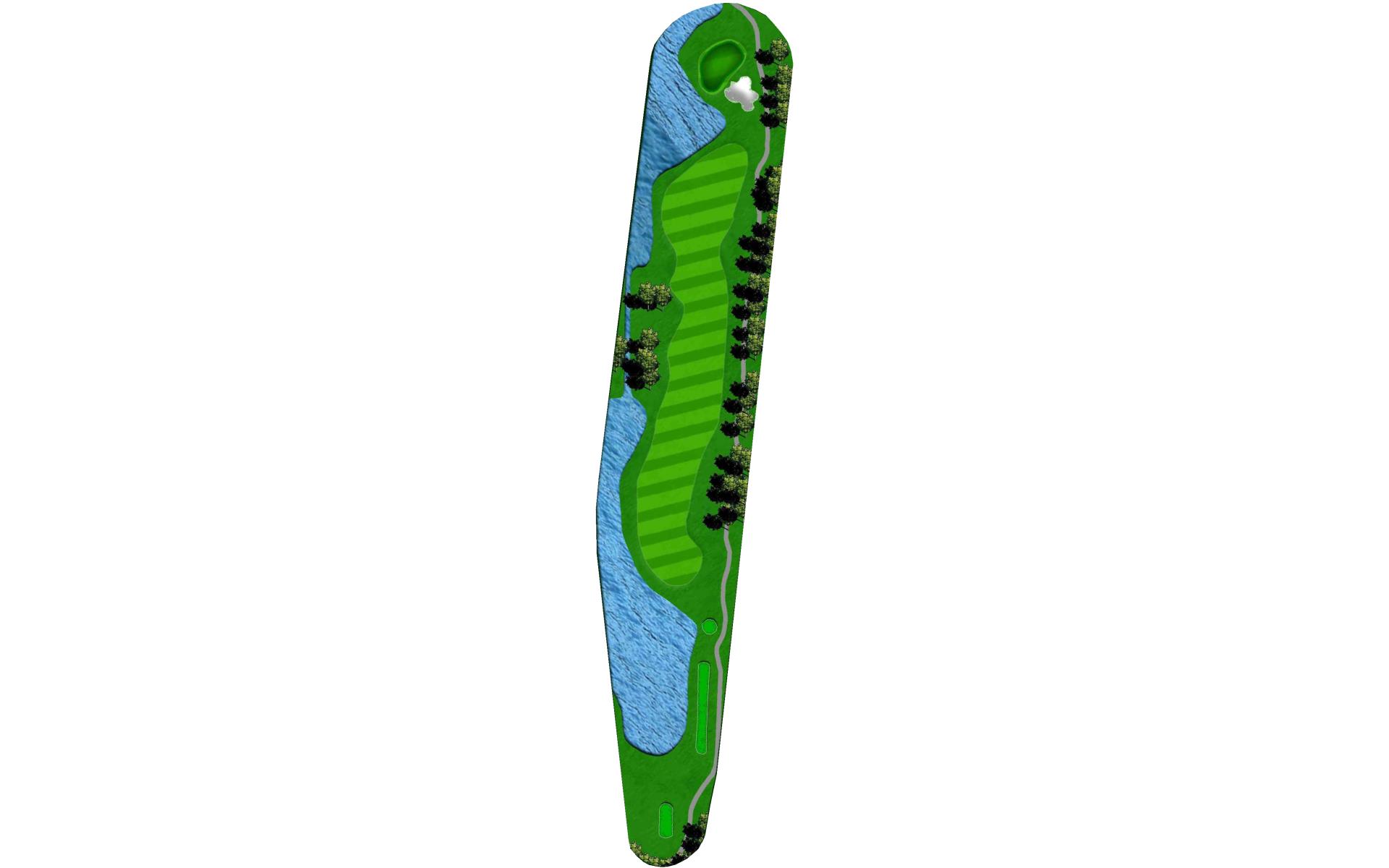 | "Bagpipes" is a long par 4 that sets up for a challenging finish. A good drive leaves a long approach into yet another peninsula green. Extreme undulation in the middle parts of the green make placement on the second shot paramount to success with the putter. |