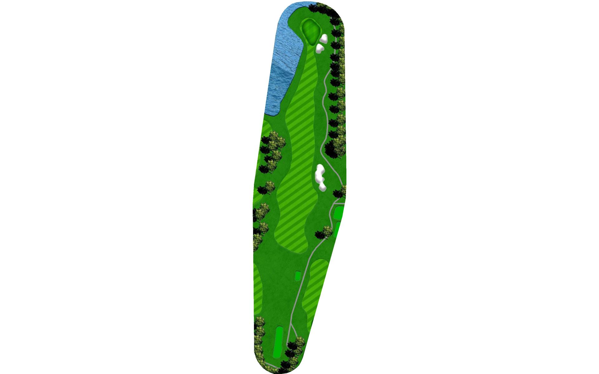 | "Patience", requires a layup off the tee for even the longest hitters. Players are then faced with a choice, go for the heavily guarded green or layup again and leave themselves with a wedge. 4 bunkers protect the front of the green while over the back and to the left is out-of-bounds. |