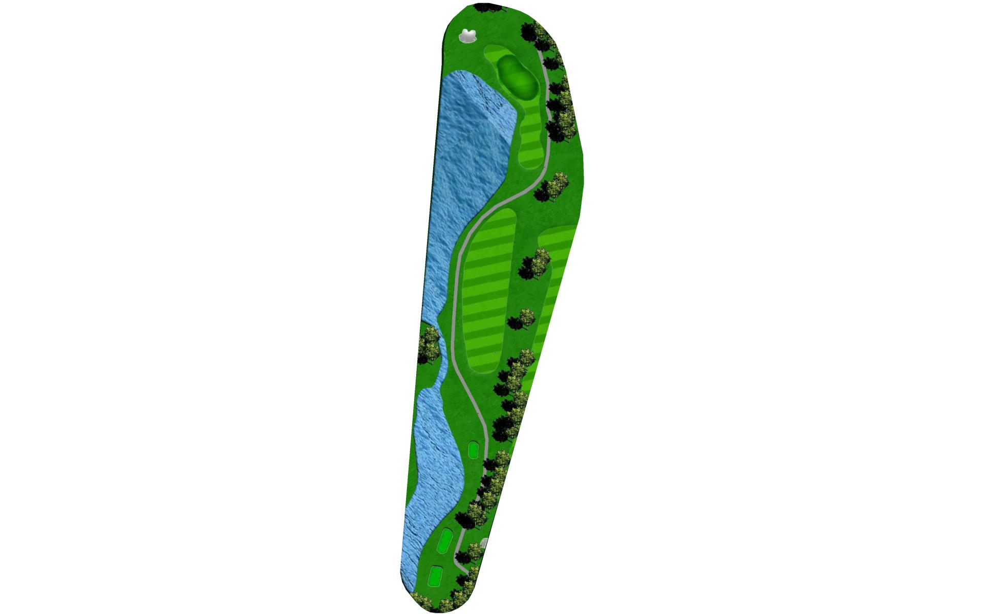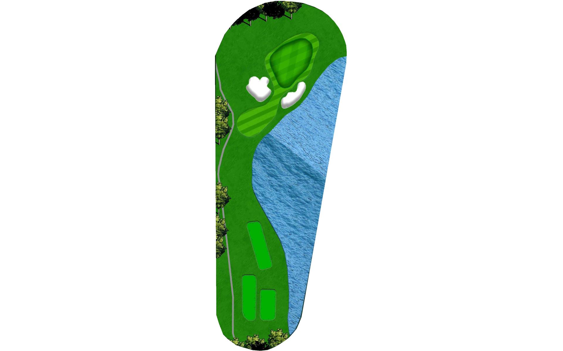 | "Eagle's Dare" is the only par 5 that does not force players to layup off the tee and is the longest hole on the golf course. Water surrounds this elevated two-tiered green on 3 sides, out-of-bounds runs down the other, and a large greenside bunker sits just short and to the right. Players should think carefully before taking it on. |
