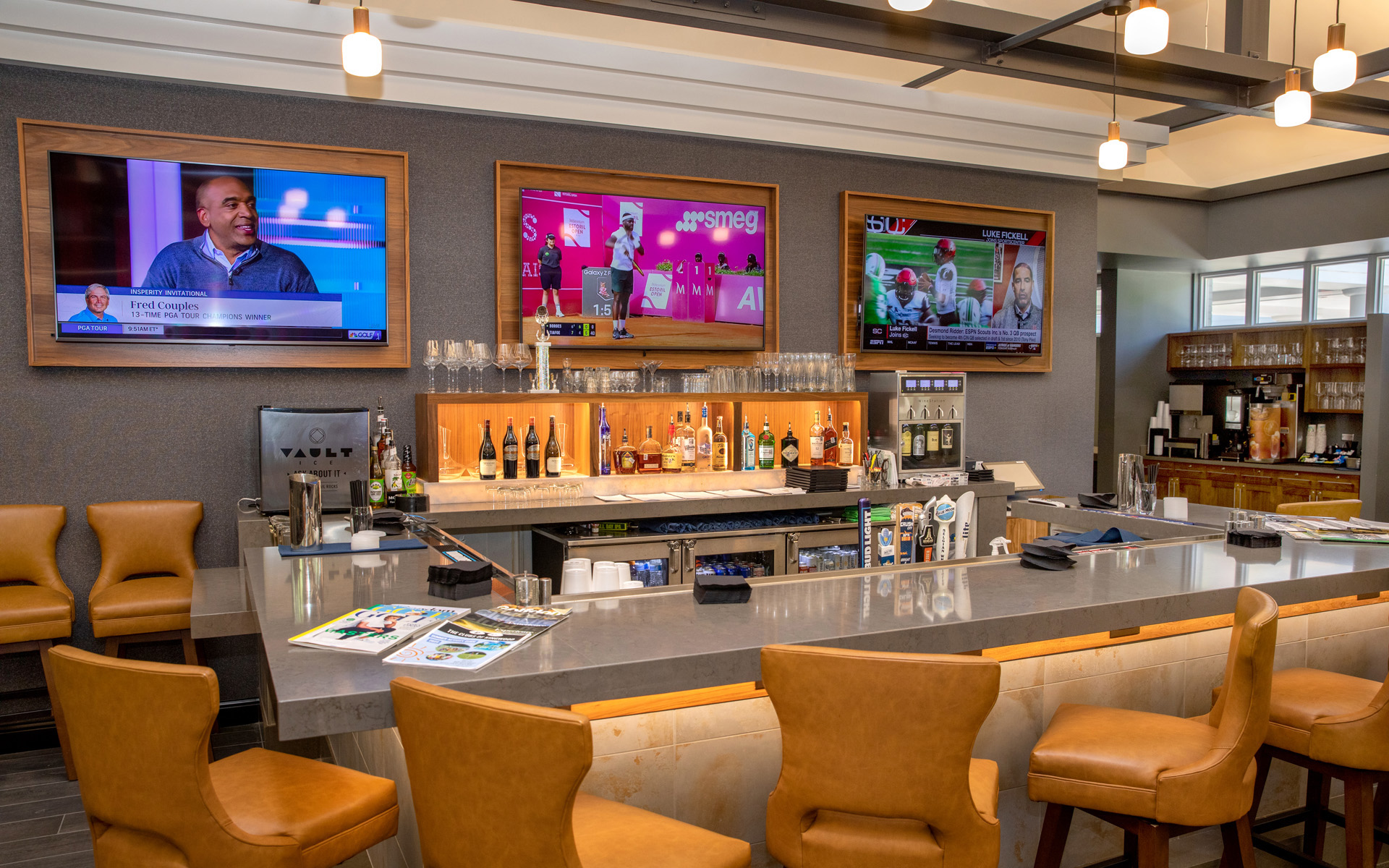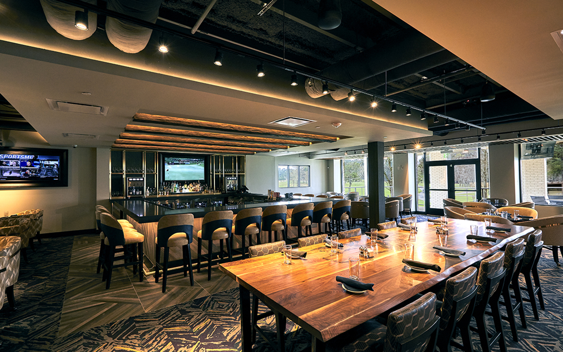 Enjoy delicious menu items and handcrafted drinks surrounded by sweeping golf course views through floor-to-ceiling windows. The joint tables and cozy atmosphere make it the perfect place to connect with friends, family, and fellow Members.