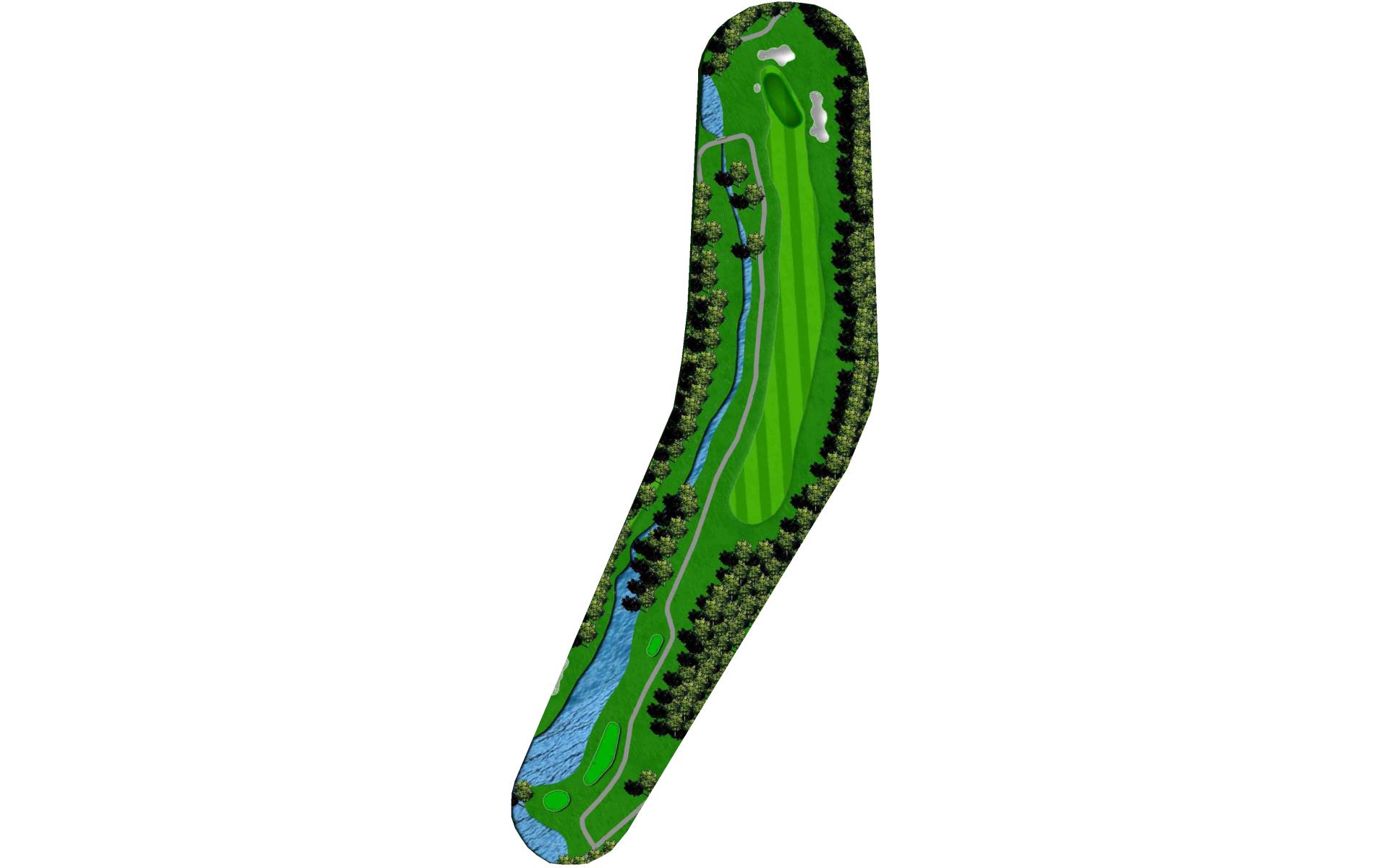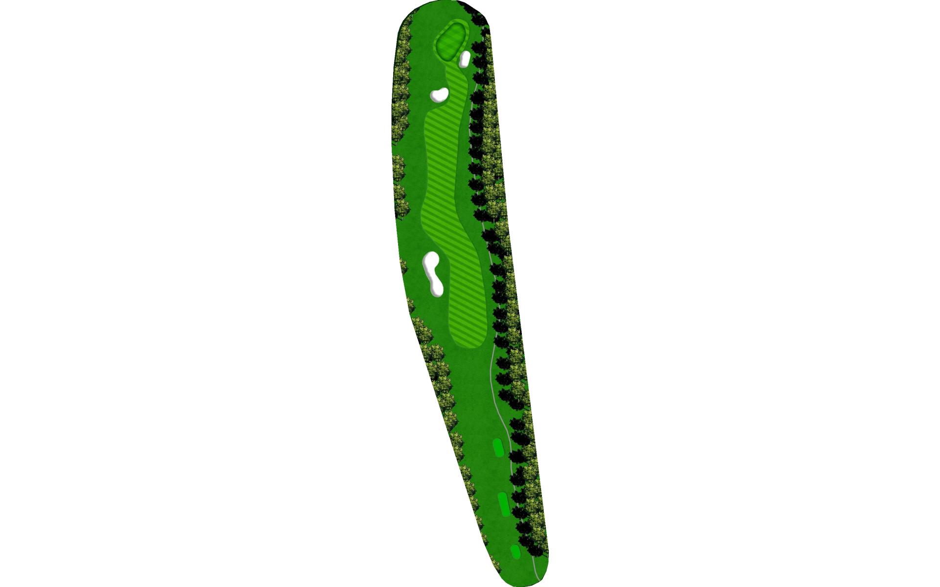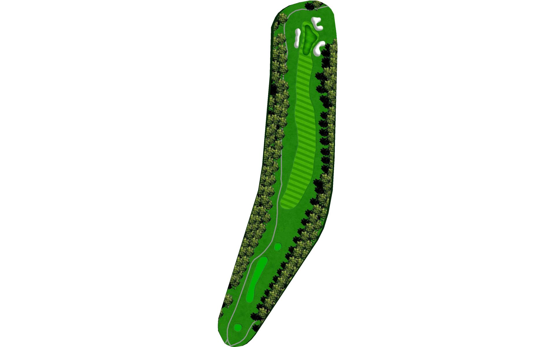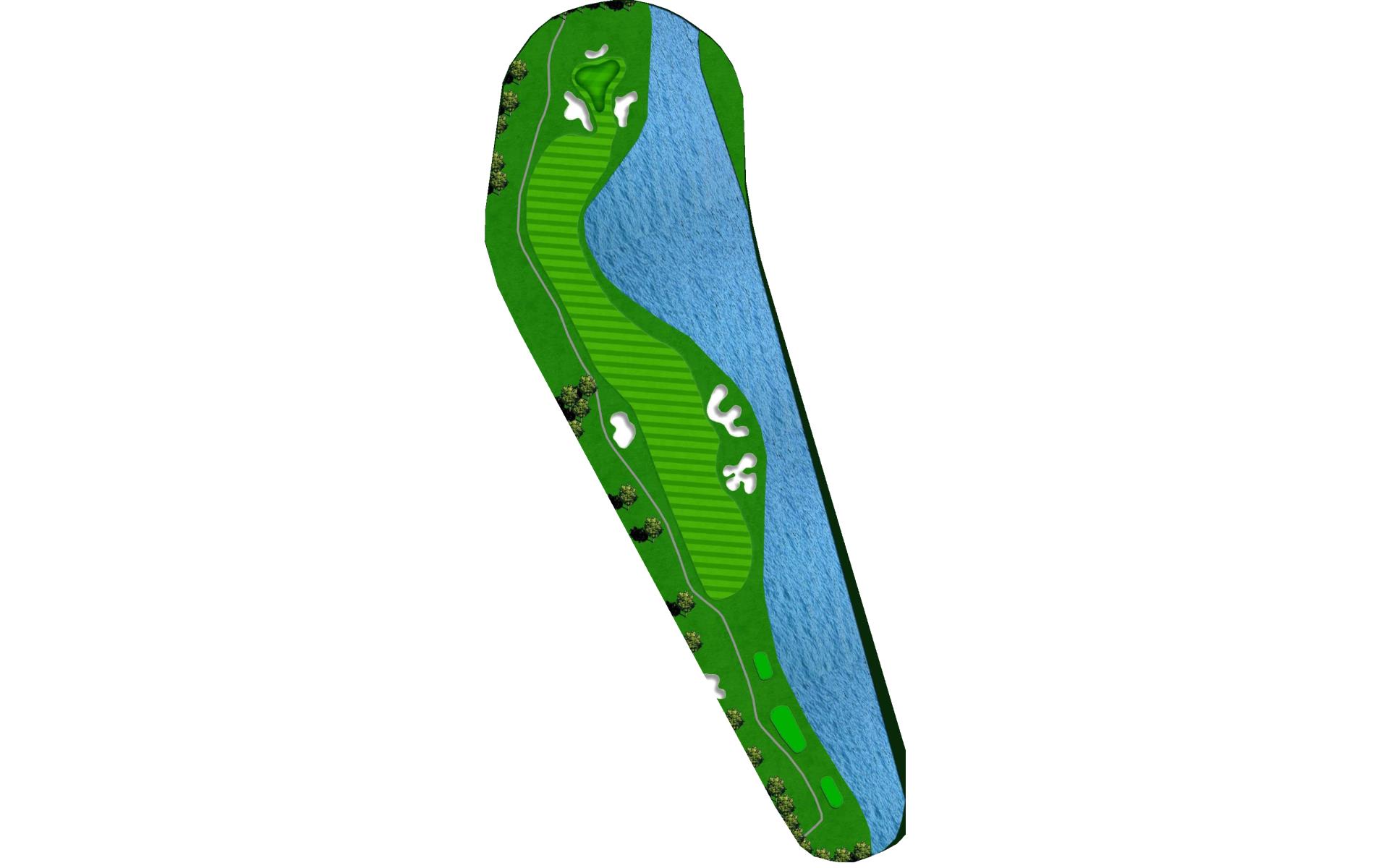 A Par 5, narrow looking tee shot with a penalty area left, past the tee shot the hole turns and opens. Grass mounds surrounding the green make for challenging pitch shots.
