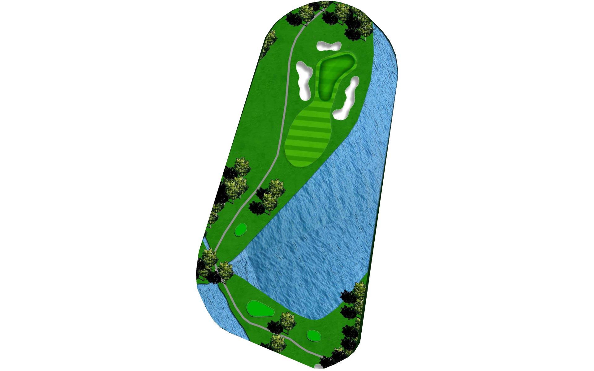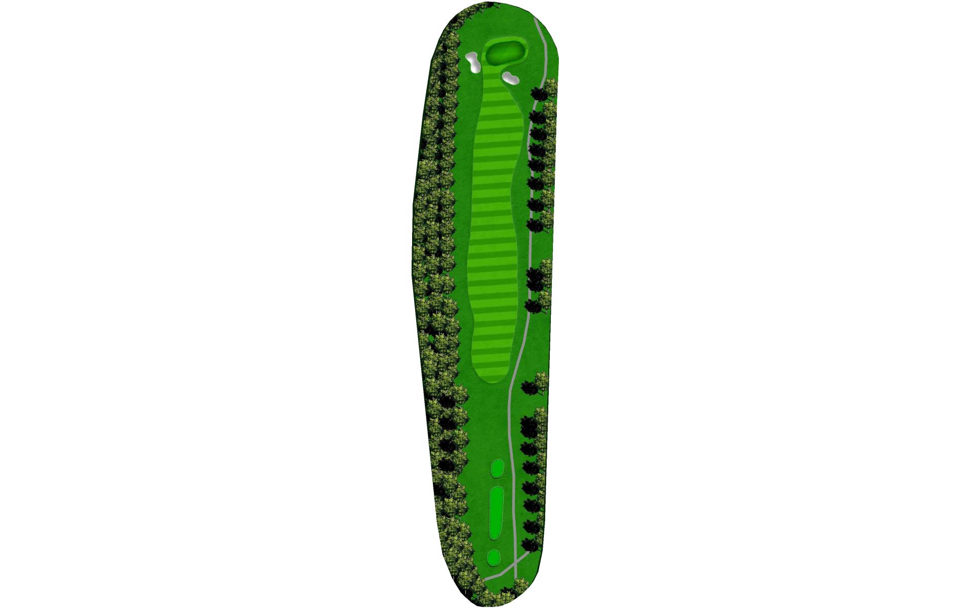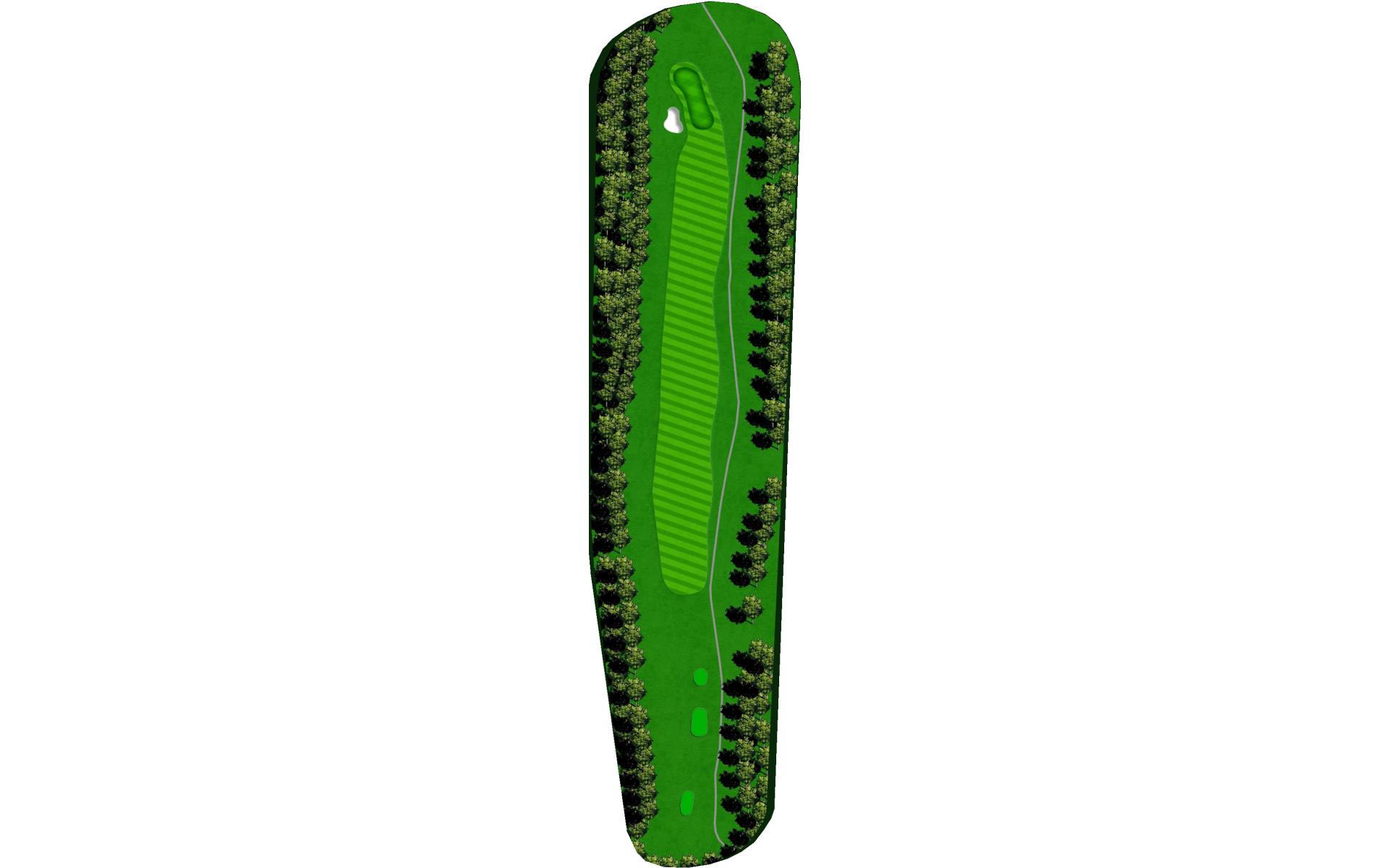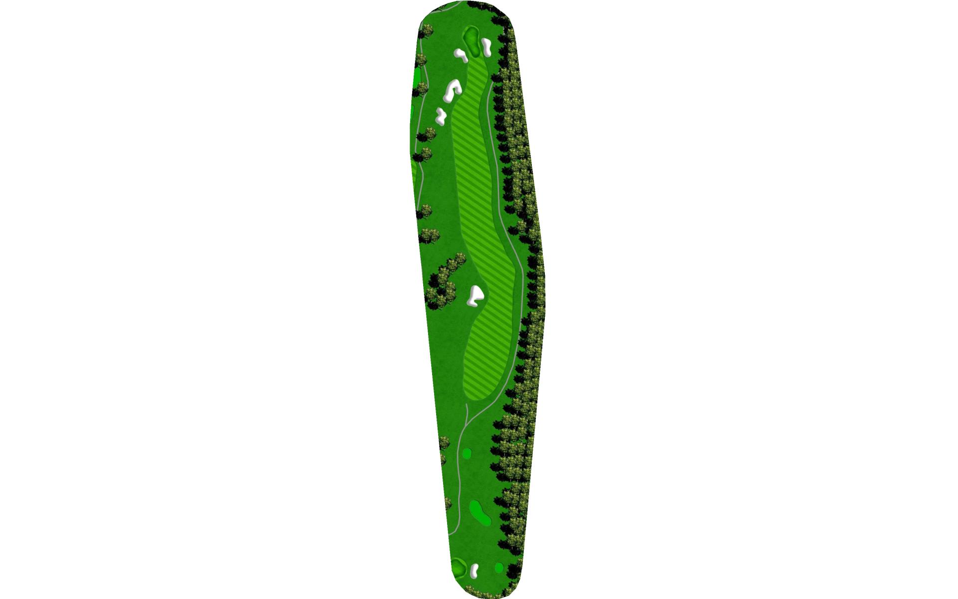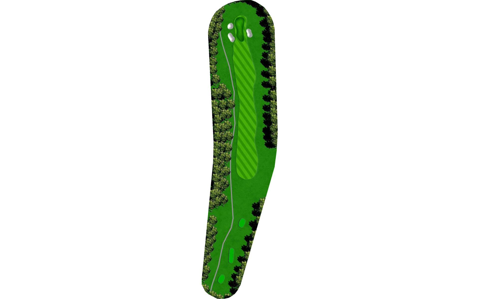 A Par 5, narrow looking tee shot with a penalty area left, past the tee shot the hole turns and opens. Grass mounds surrounding the green make for challenging pitch shots.