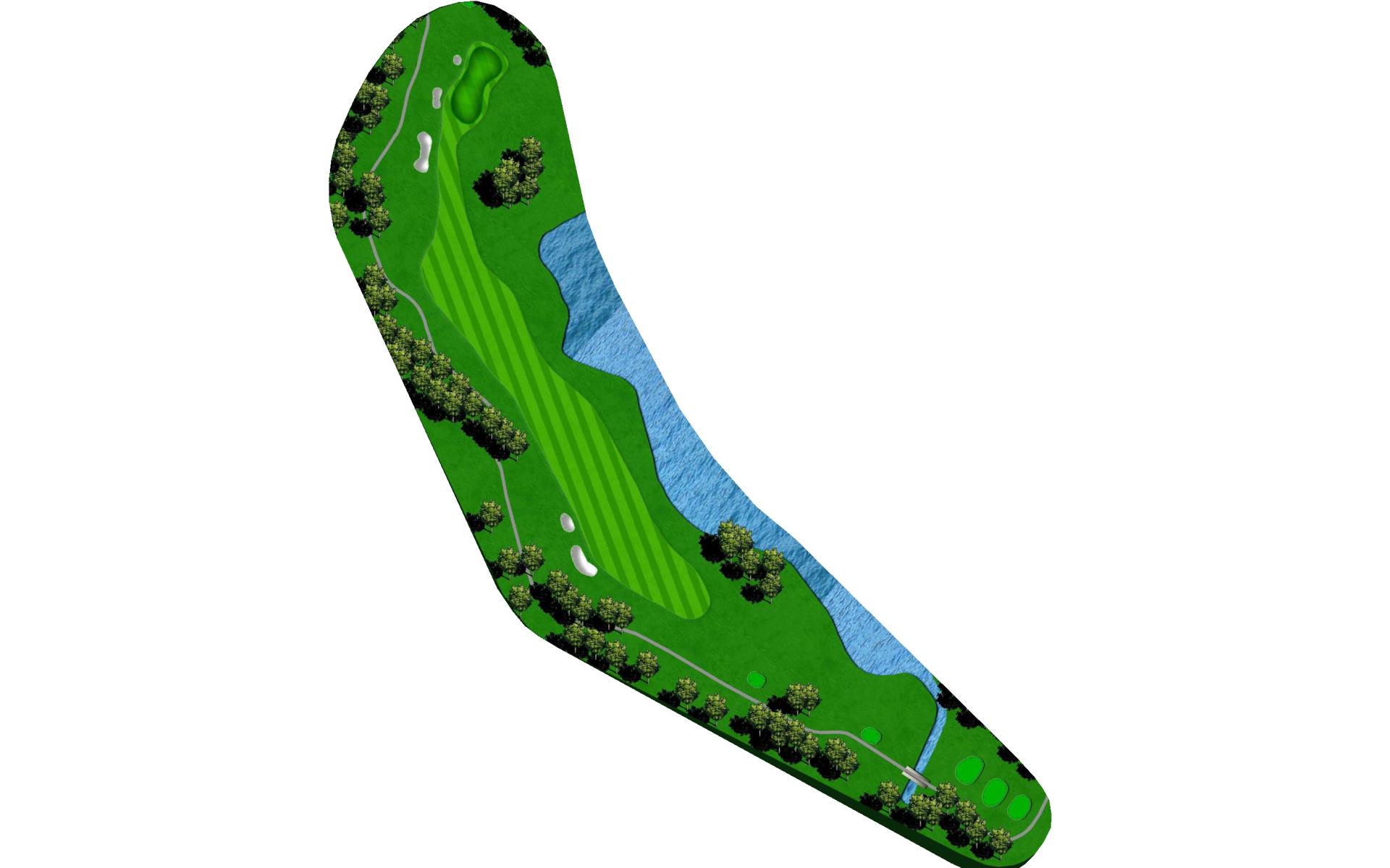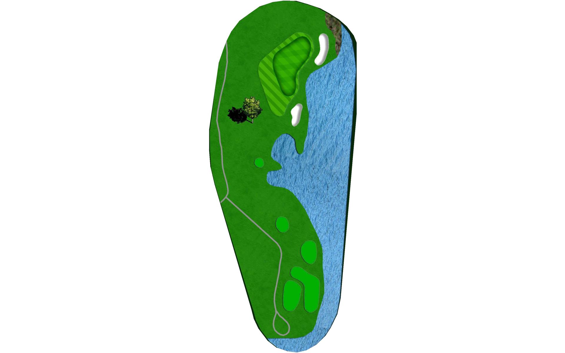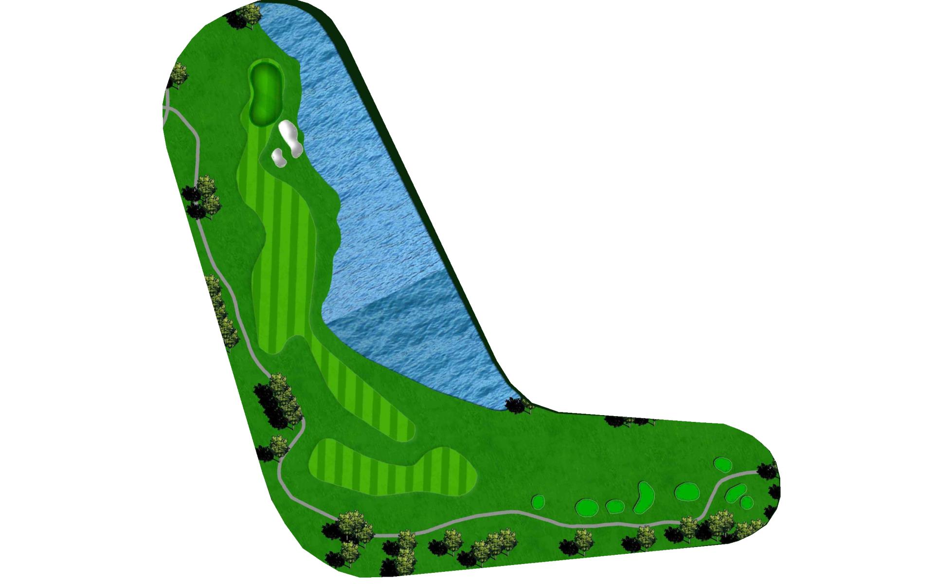 This beautiful Par 3 is well guarded by water on the left and 3 dangerous bunkers on the right. Aim right center of the green as the slope will feed most balls to the left.