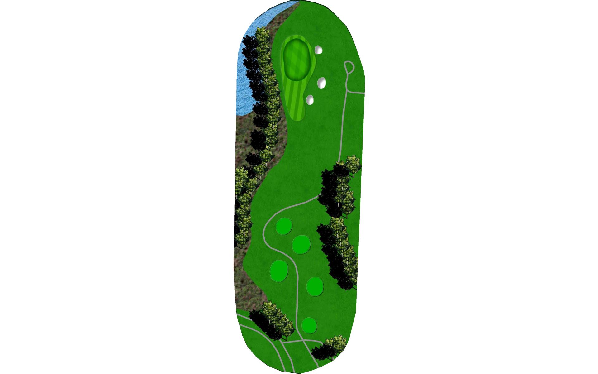 Nowhere to hide on this short Par 3. Water and bunkers right and a deep dropoff to the left make this hole a must for accuracy.