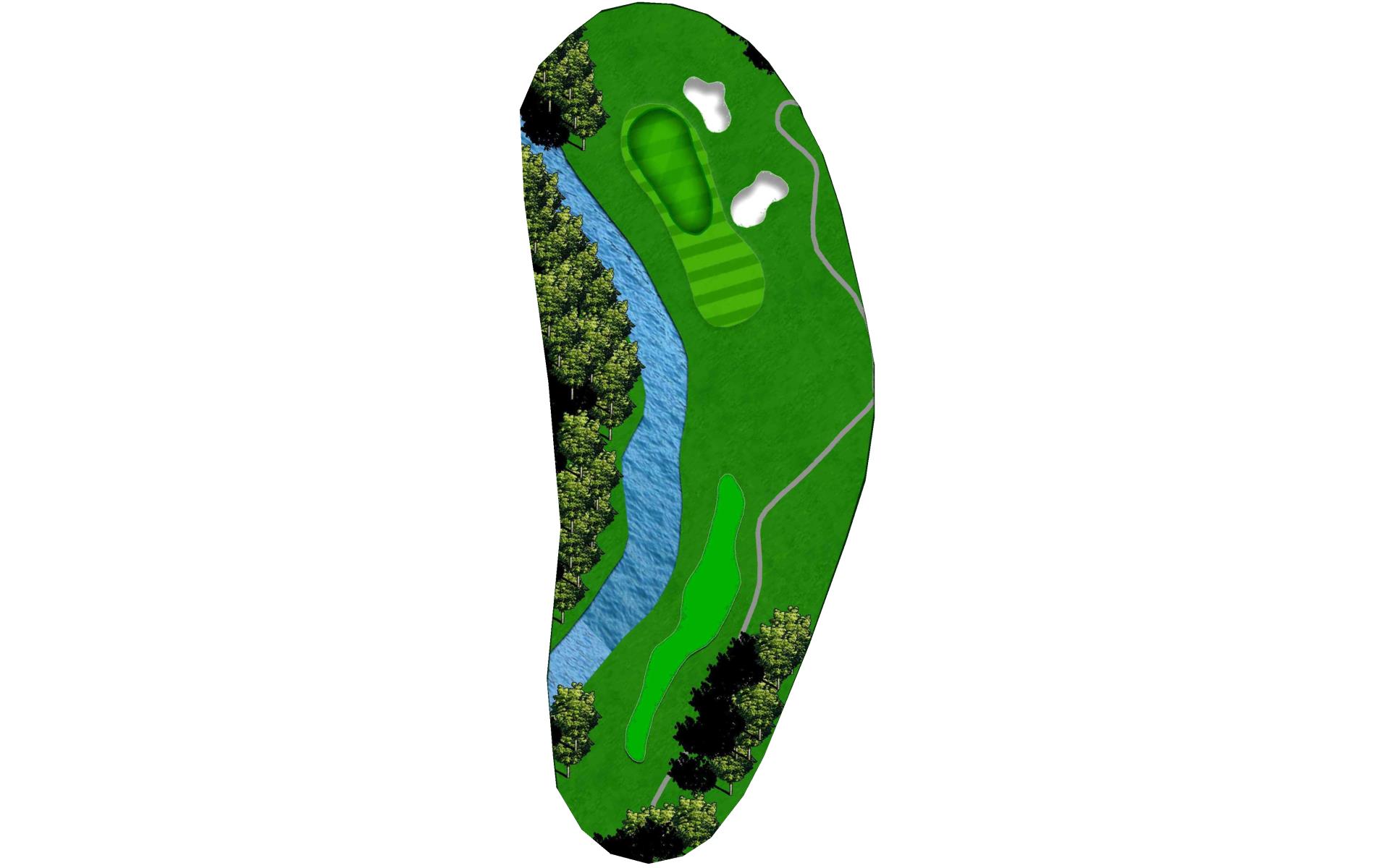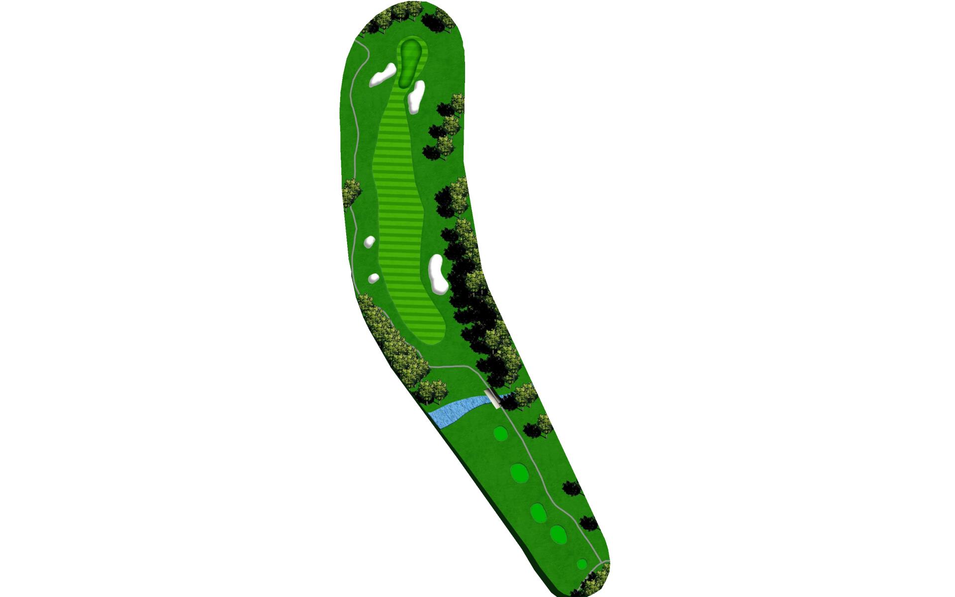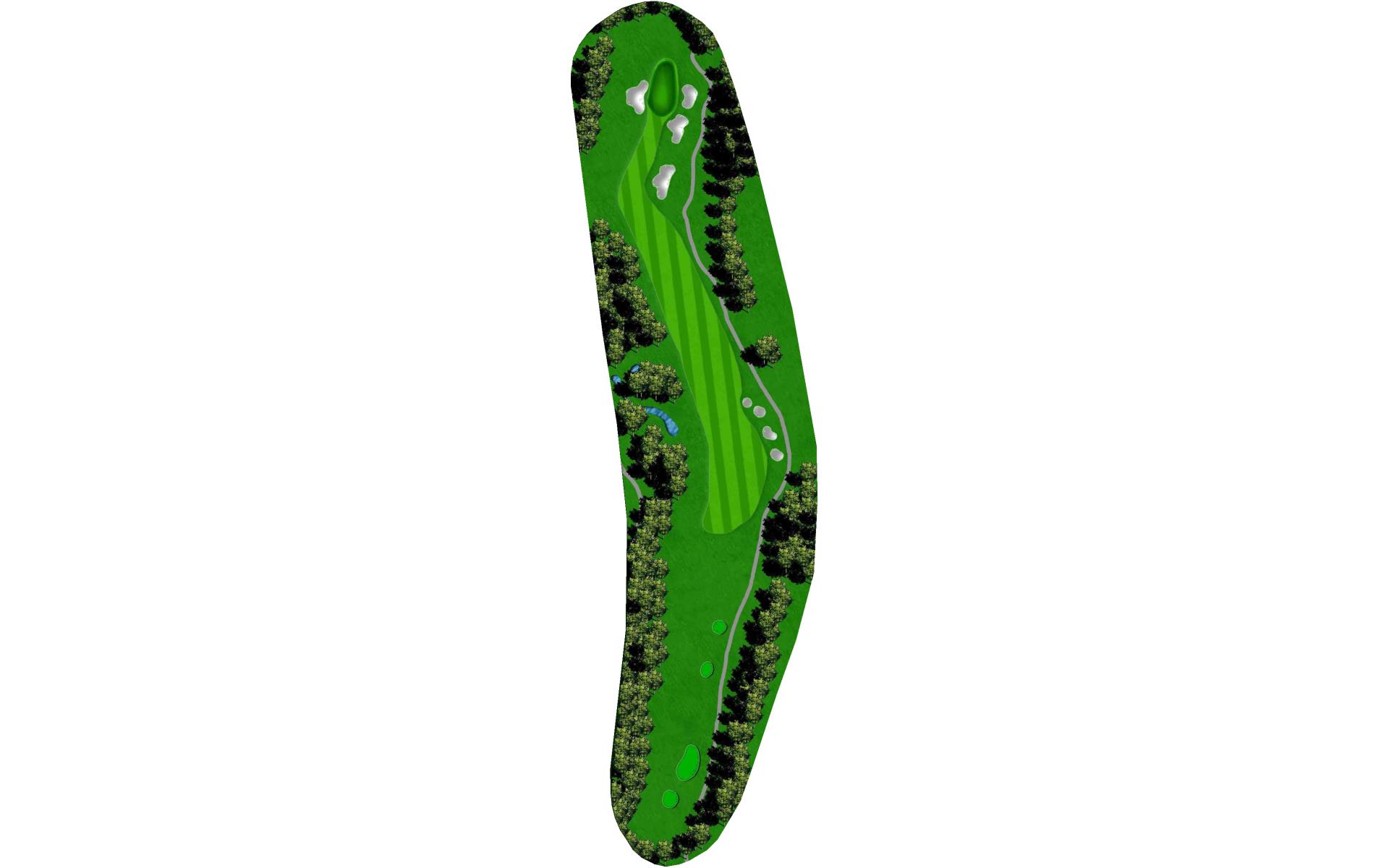 A medium length par 4 that dog legs slightly left. Tee shot should favor the right side of the fairway. A strong tee shot with some draw shape is ideal. The large tree on the left side of the hole will knock any tee shot too far left straight down into the rough. Favor the right side of the green with your approach shot. Any shot that lands left of the center of the green will release left quickly toward the creek. First bounce is typically firm, so play for some release.