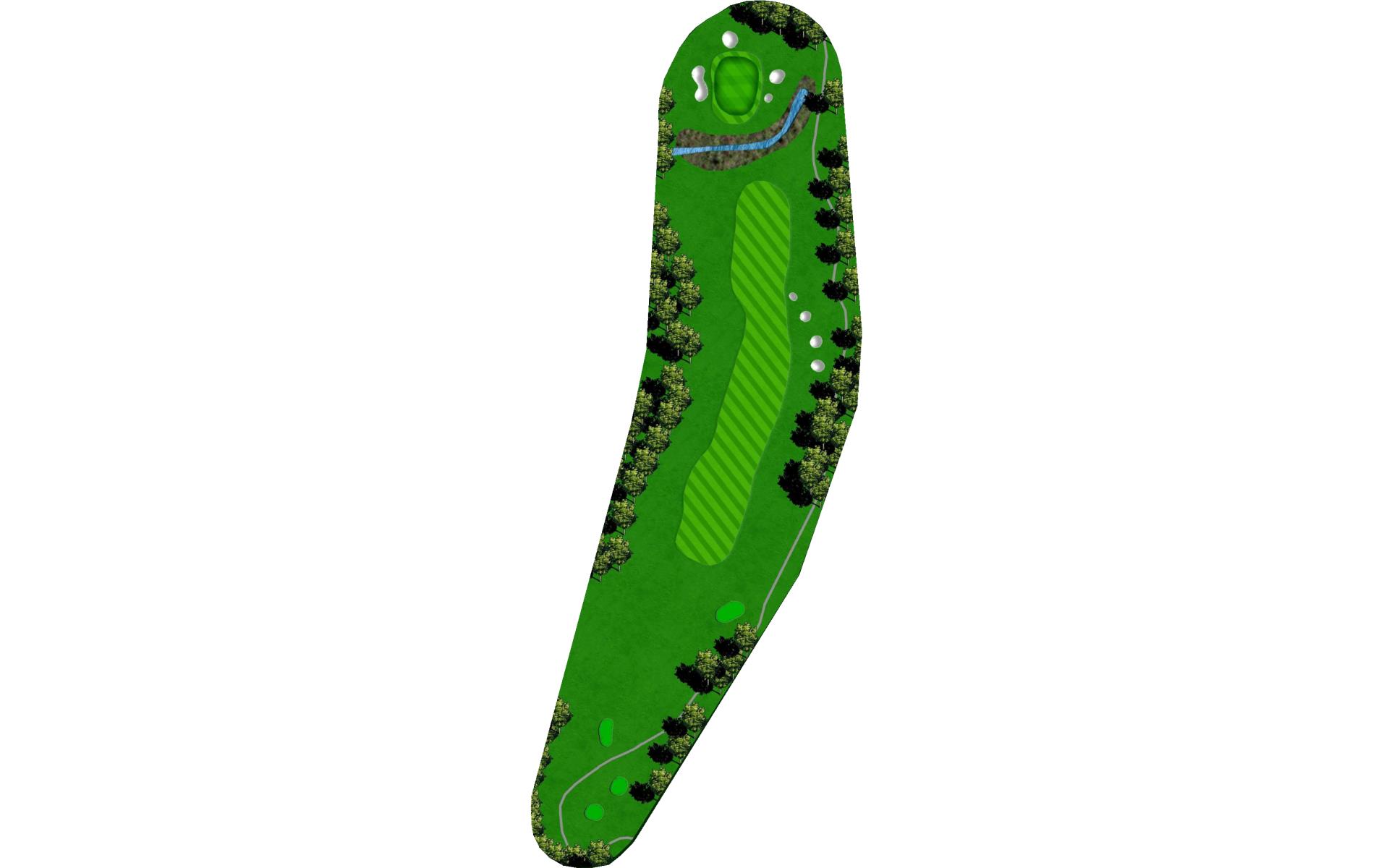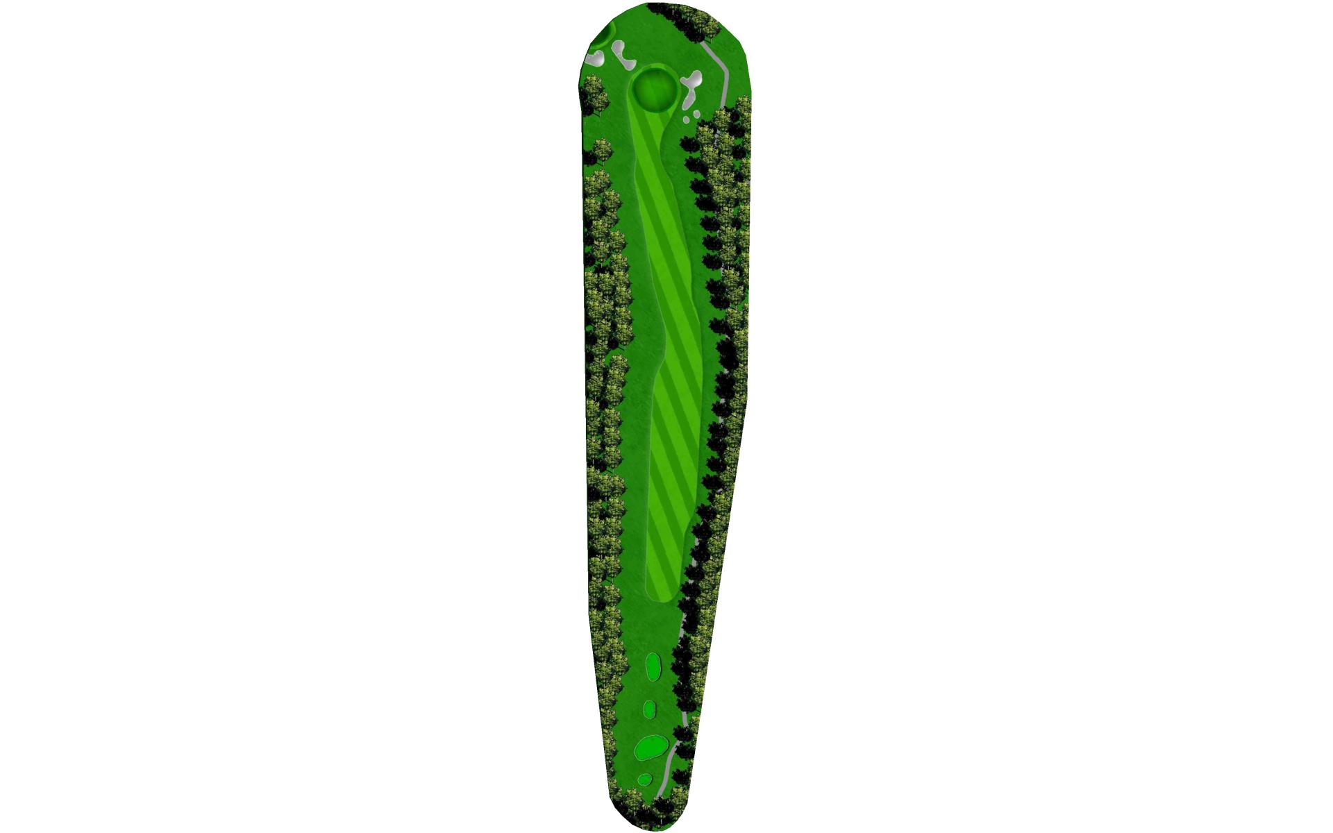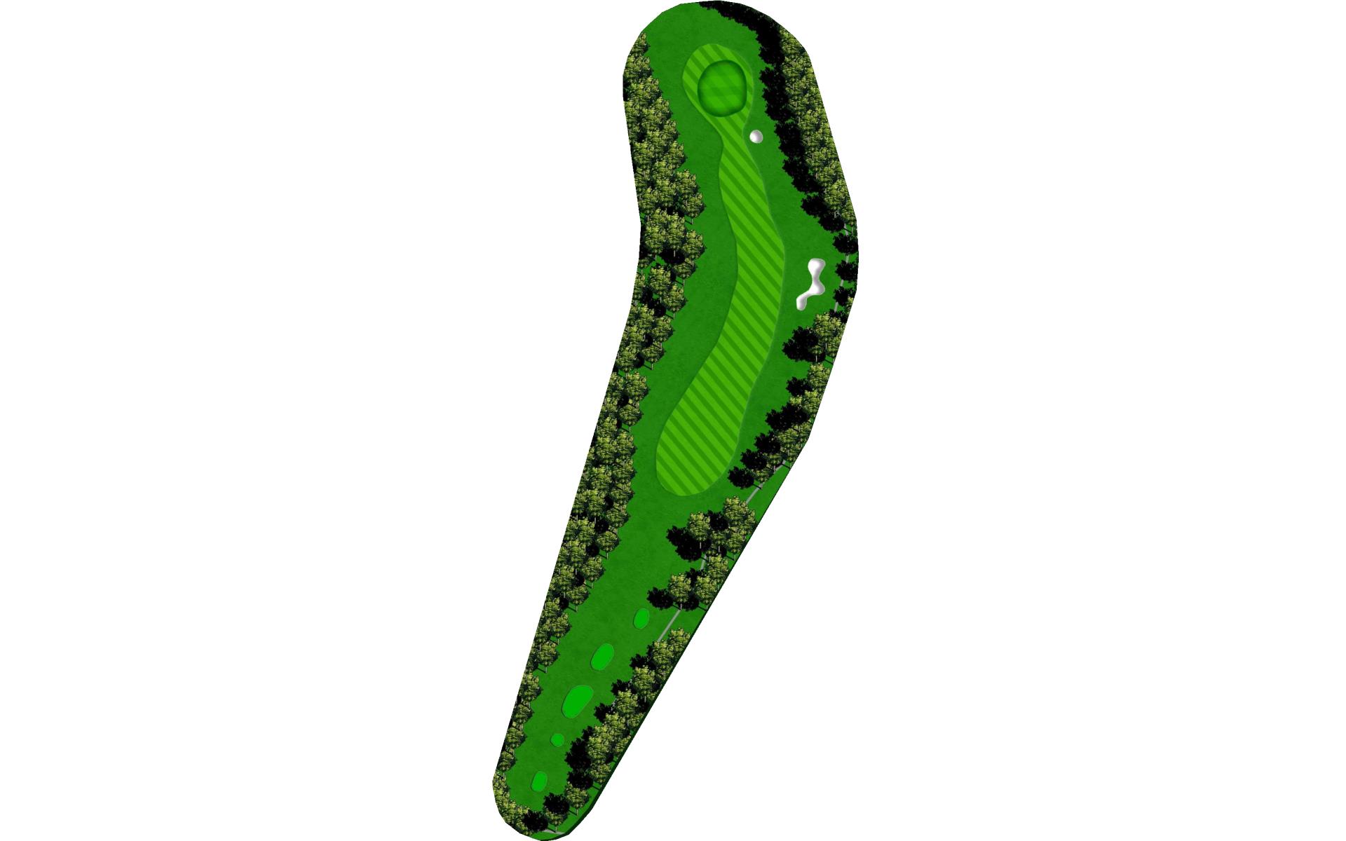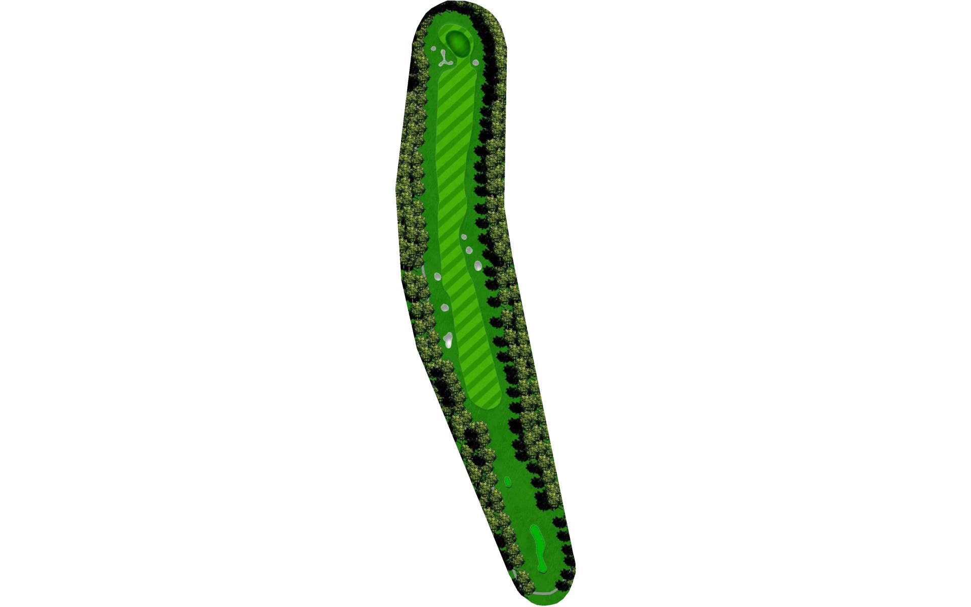 The last of the par 5s requires a good drive down the left center to have any chance at reaching it in two. The best way to approach this hole is to plan for a 3 shot routine. A good layup will leave a short wedge shot into a sloped green. The green is well protected with bunkers, but there is plenty of green to work with.